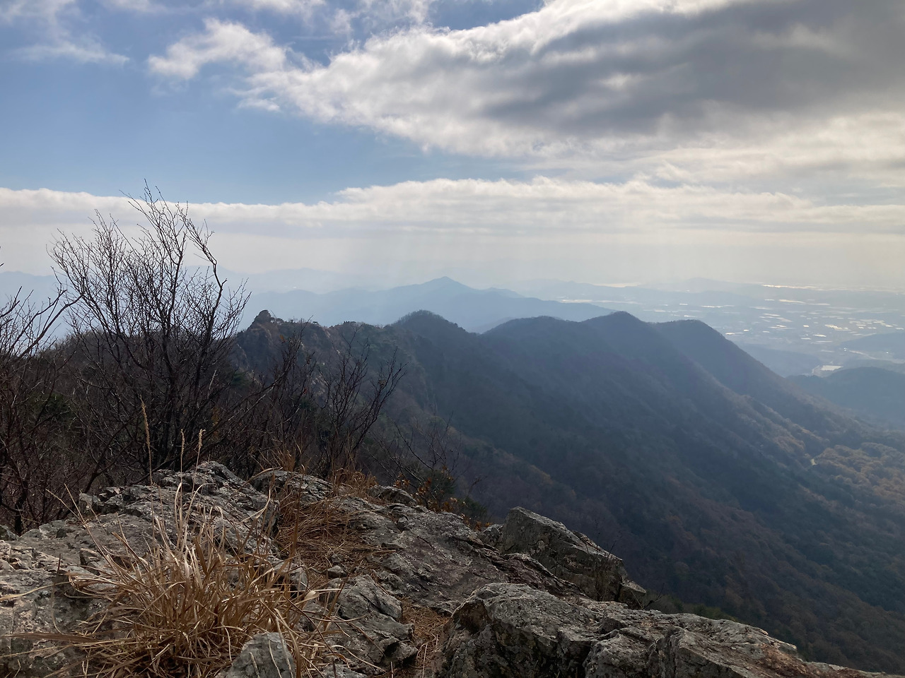 정상 조금 아래 논산시 상월면 쪽으로 널찍한 바위가 있었다. 그 바위에 앉아 배낭에 준비해 간 사과 반쪽과 삶은 고구마 한 개를 먹었다. 까만 독수리가 휘이익 날아갔다. 만행산 천황봉에서도 본 적이 있다. 지리산에 비할 바는 아니지만 내가 걸어온 능선을 바라보니 뿌듯했다.