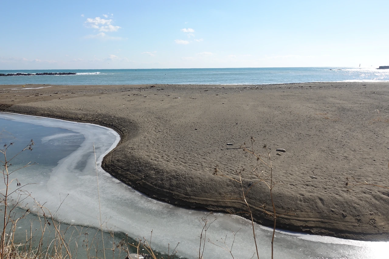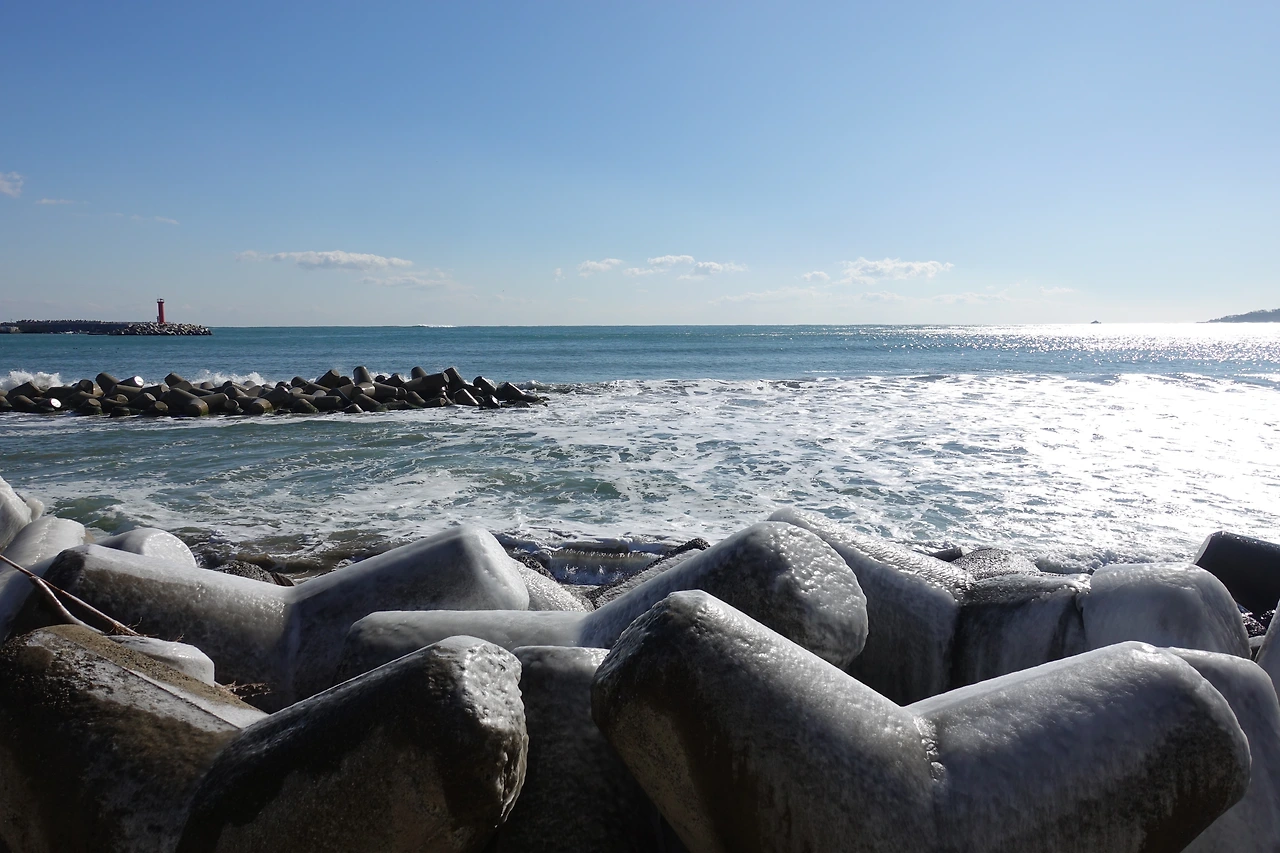 강으로 통하는 하천도 얼어붙은 겨울 오후에 초록 푸른 노란색이 섞인 바다는 새하얀 포말을 얹고 출렁인다.