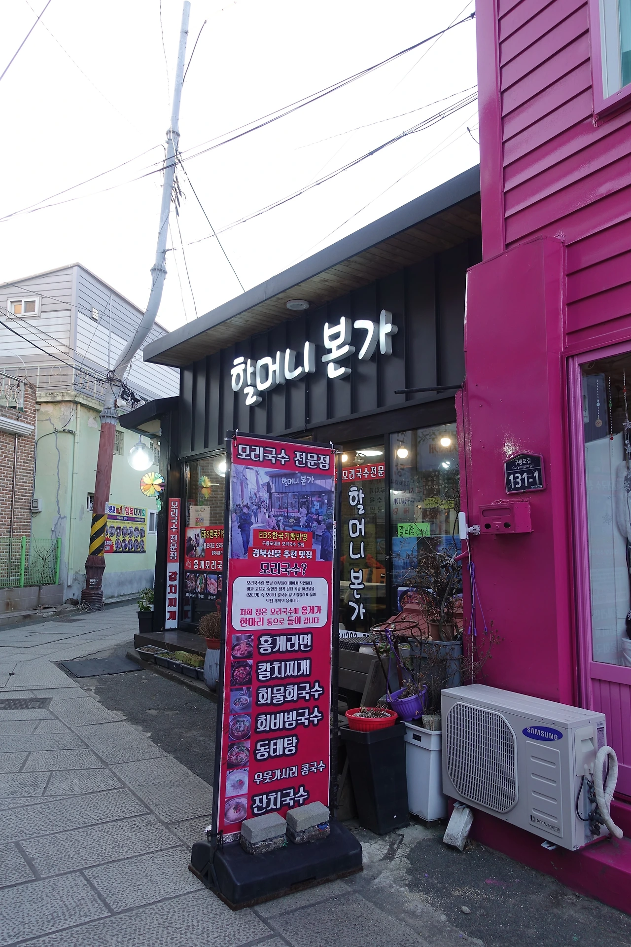 계단을 내려와 근대가옥거리로 무얼 먹을까 둘러보며 걸어 들어갔다. 모리국수 전문점 할머니 본가가 있었다. 모리국수가 뭔지 먹어보고 싶었는데 2인분만 된다고 한다. 1인분으로 먹을 수 있는 메뉴는 두 가지뿐. 그 중 홍게라면을 주문했다. 도보순례에 라면이라니 부실했지만, 홍게를 믿어보기로 했다. 잠시 후 할머니가 홍게라면을 가져오셨다. 그러더니 홍게를 가져가 싹 발라오셨다. 먹기 편하라고. 이번 순례에선 친절한 식당 주인만 만나서 좋았다.