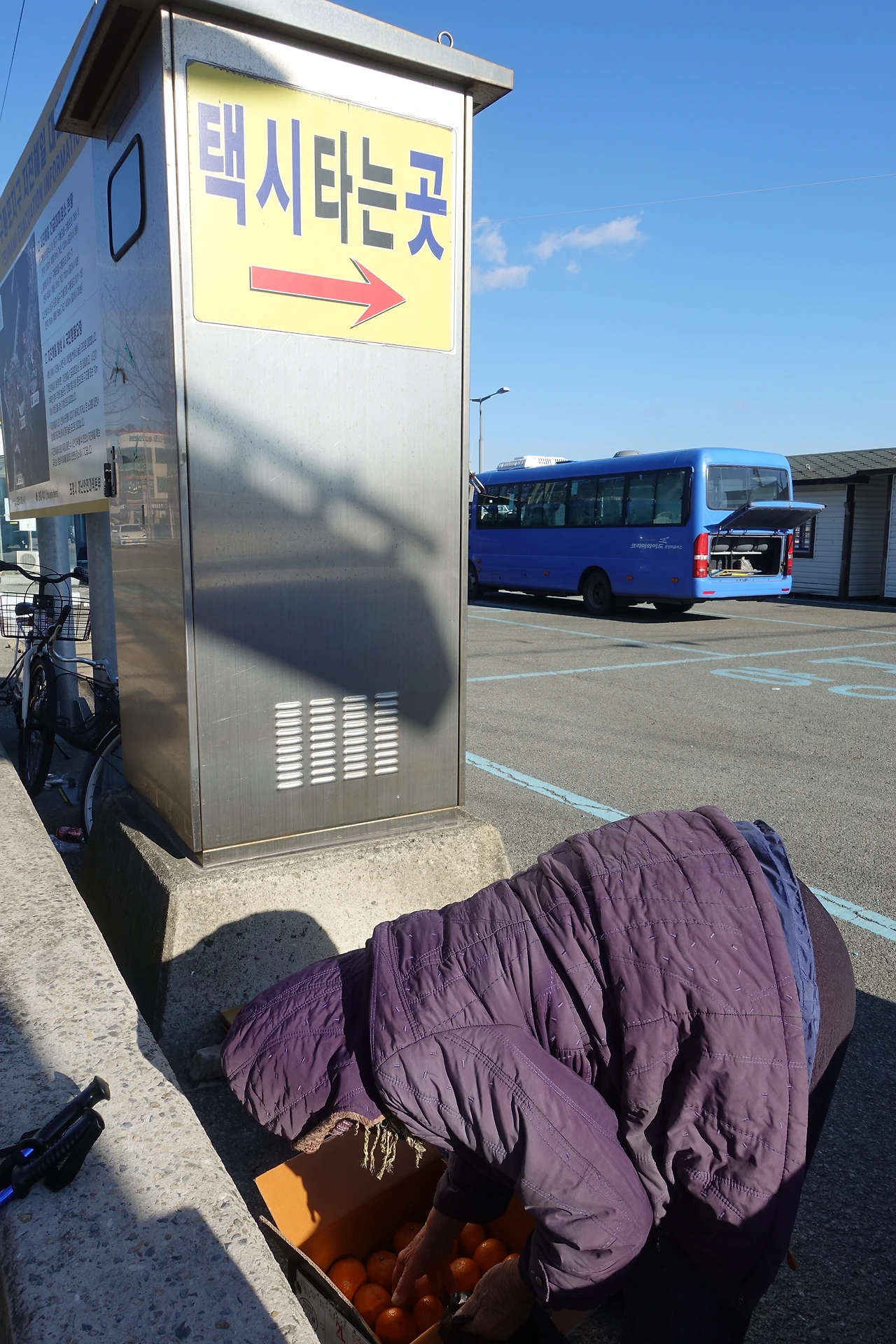 택시 타는 곳을 지났다. 그런데 몇 발자국 가다 다시 돌아갔다. 할머니 한 분이 땅바닥에서 귤을 팔고 계셨다. 그 추운 날에.