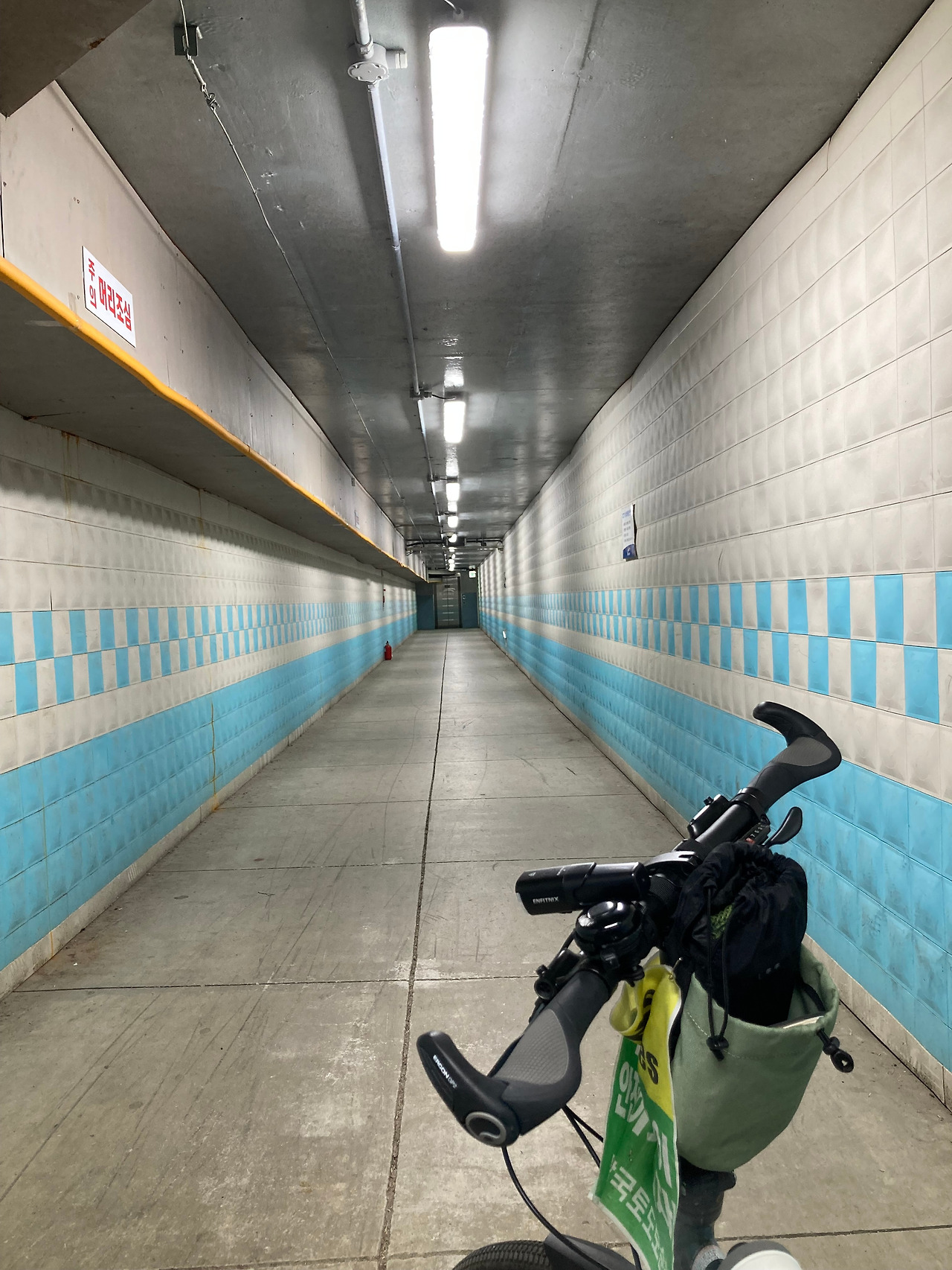 잠시 쉬면서 물을 마시고 화장실도 다녀왔다. 그리고 선을 따라갔더니 엘리베이터가 나왔다. 엘리베이터를 탔더니 지하로 깊이 내려갔다. 문이 열리자 통로가 나왔다. 아마 강바닥 아래인 듯했다. 아무도 없는 으슥한 통로를 지나 반대편 엘리베이터를 타고 올라왔다. 길이 약간 헷갈렸지만, 오른쪽으로 있는 김포 방향으로 한강을 따라 계속 갔다.