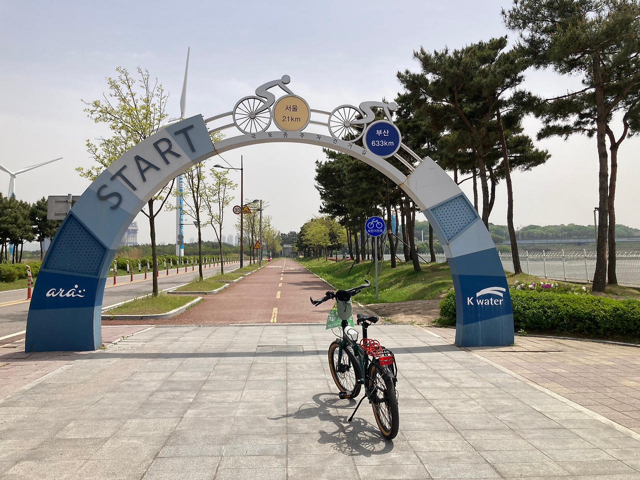 7.3km 자전거를 타고 가 디지털미디어시티역에서 인천국제공항행 지하철을 타고 청라국제도시로 갔다. 서울시 지하철에는 주말에만 맨 앞뒤 칸에 자전거 탑승을 허용한다. 평일이지만 뷔나는 접이식 자전거라 지하철에 싣고 갈 수 있었다. 역에서 3.6km를 달려 아라 서해갑문으로 갔다. 가는 길에 정서진 표지를 보았다. 시작점까지 가는 데도 두 시간 걸렸다. 하지만 시커먼 뻘밭 앞에 START와 FINISH가 한 지점에 있는 건 볼만했다. 시작점이 종착점이 될 수도 있다니 먼 길 가는 인생에 아이러니가 아닐 수 없지만, 그 또한 받아들여야 할 때가 있을 듯했다.