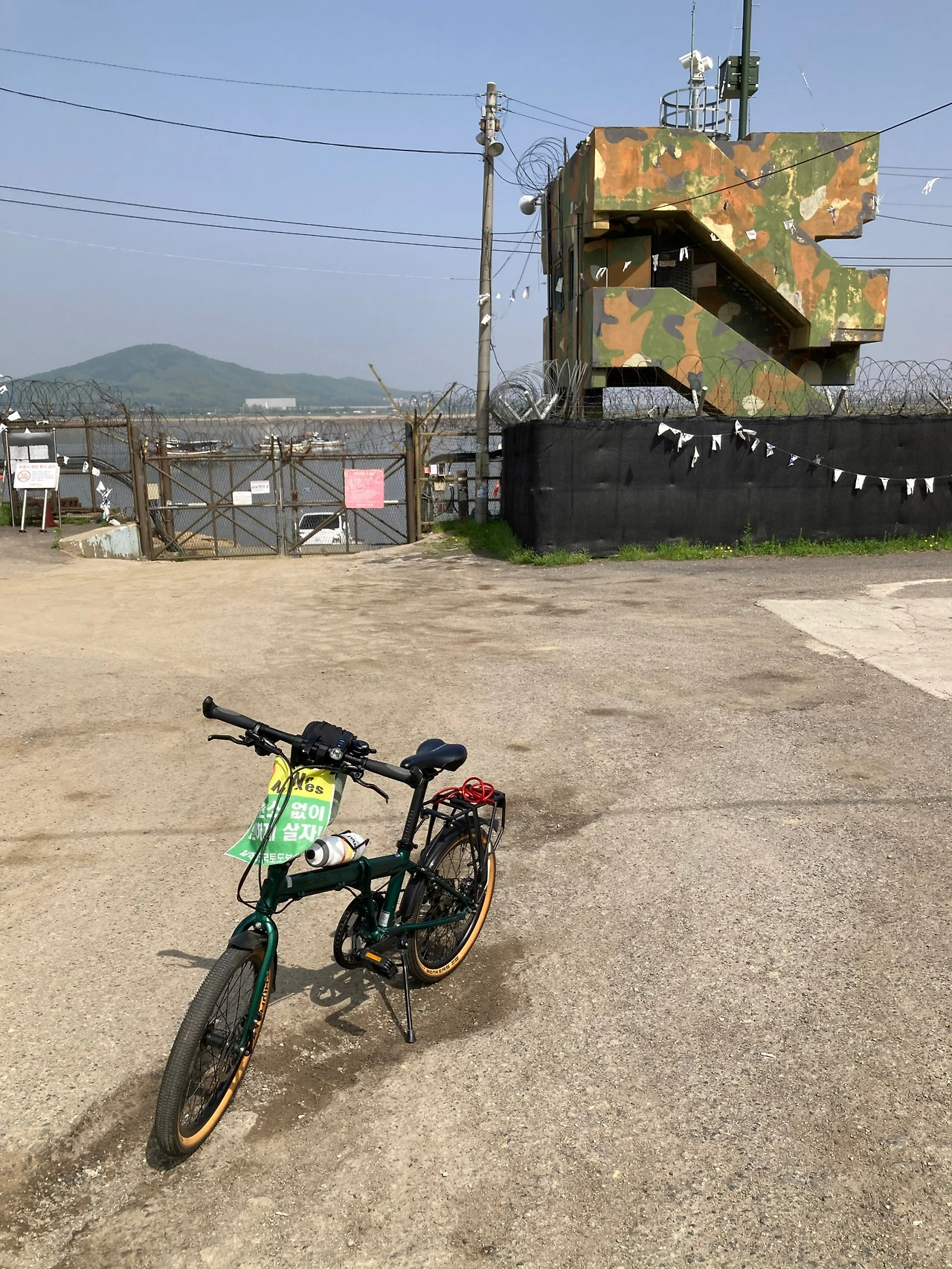 한참을 달리니 전류리 포구가 나왔다. 단체 사진전 [분단 70년] 1차 촬영하러 왔던 곳이었다. 예전 추억이 떠올라 미소 지으며 강 따라 계속 올라갔다. 군인들이 보이기 시작하고 군사 지역 표시가 보였다. 바닥엔 올리브 잎 관을 쓴 비둘기 그림이 있었고, 길이름은 평화누리길이었다. 너른 들도 보였고 네모난 철창에 독수리로 보이는 맹금류가 보였다. 한국조류보호협회였다. 논인지 밭인지 양쪽으로 펼쳐진 먼지 날리는 좁은 길을 한참 달렸다. 애기봉 입구라는 표지를 보고서야 멈췄다.