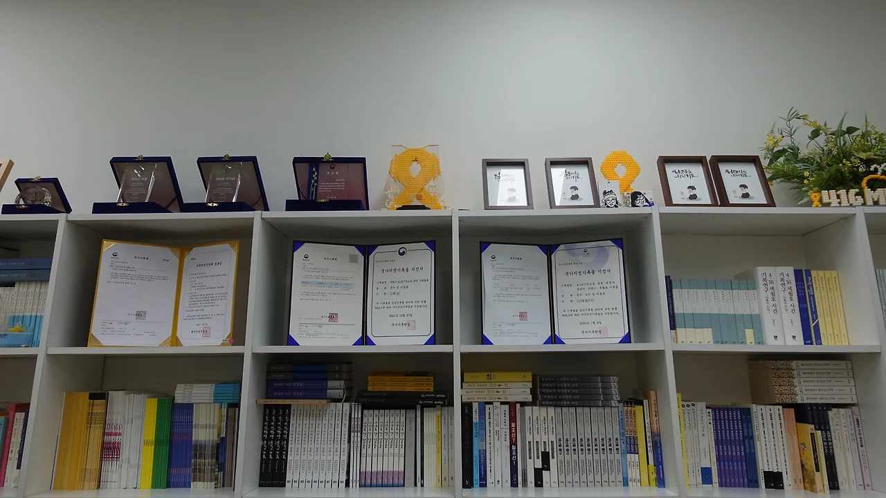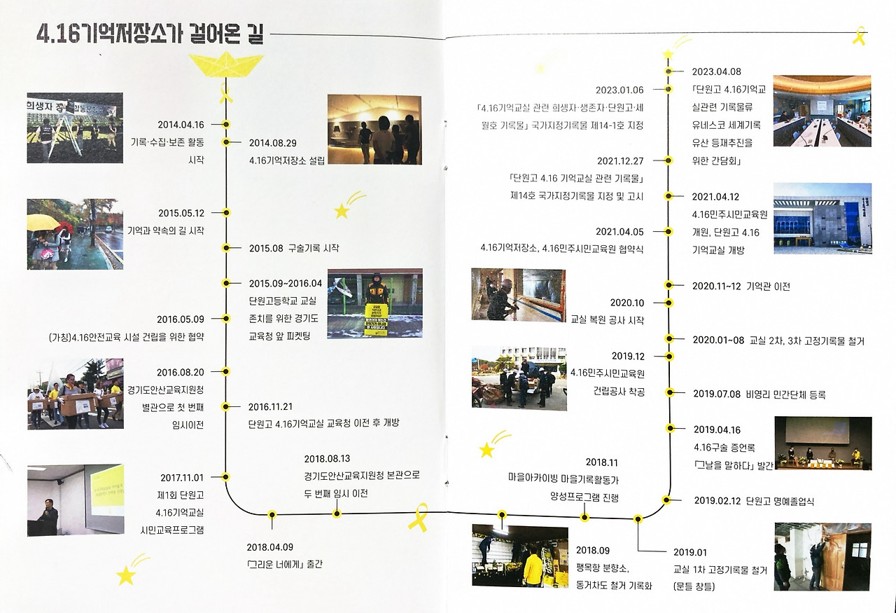 2014. 04.16. 참사 당일부터 기록, 수집, 보존 활동을 시작해서 08월 29일 4.16 기억저장소를 설립했습니다. 2015.08. 구술기록을 시작해서 4년 후엔 2019. 04. 16. 4.16 구술 증언록 <그날을 말하다>를 발간했습니다. 2016년 8월 20일에 경기도안산교육지원청 별관으로 첫 번째 임시이전하고 2018년 8월 13일 경기도안산교육지원청 본관으로 두 번째 임시 이전한 4.16 기억저장소는 2019년 7월 8일 비영리 민간단체로 등록했고, 2021년 4월 5일에 4.16 민주시민교육원과 협약식을 한 후, 4월 12일 4.16 민주시민교육원 개원과 함께 단원고 4.16 기억교실을 개방했습니다. 그리고 2년 후엔 2023년 1월 6일 <4.16 기억교실 관련 희생자, 생존자, 단원고, 세월호 기록물>은 국가지정기록물 제14-1호로 지정되었습니다. 내용물로는 문서, 도서, 박물류 113 철(410건)이 지정되어 있었습니다.