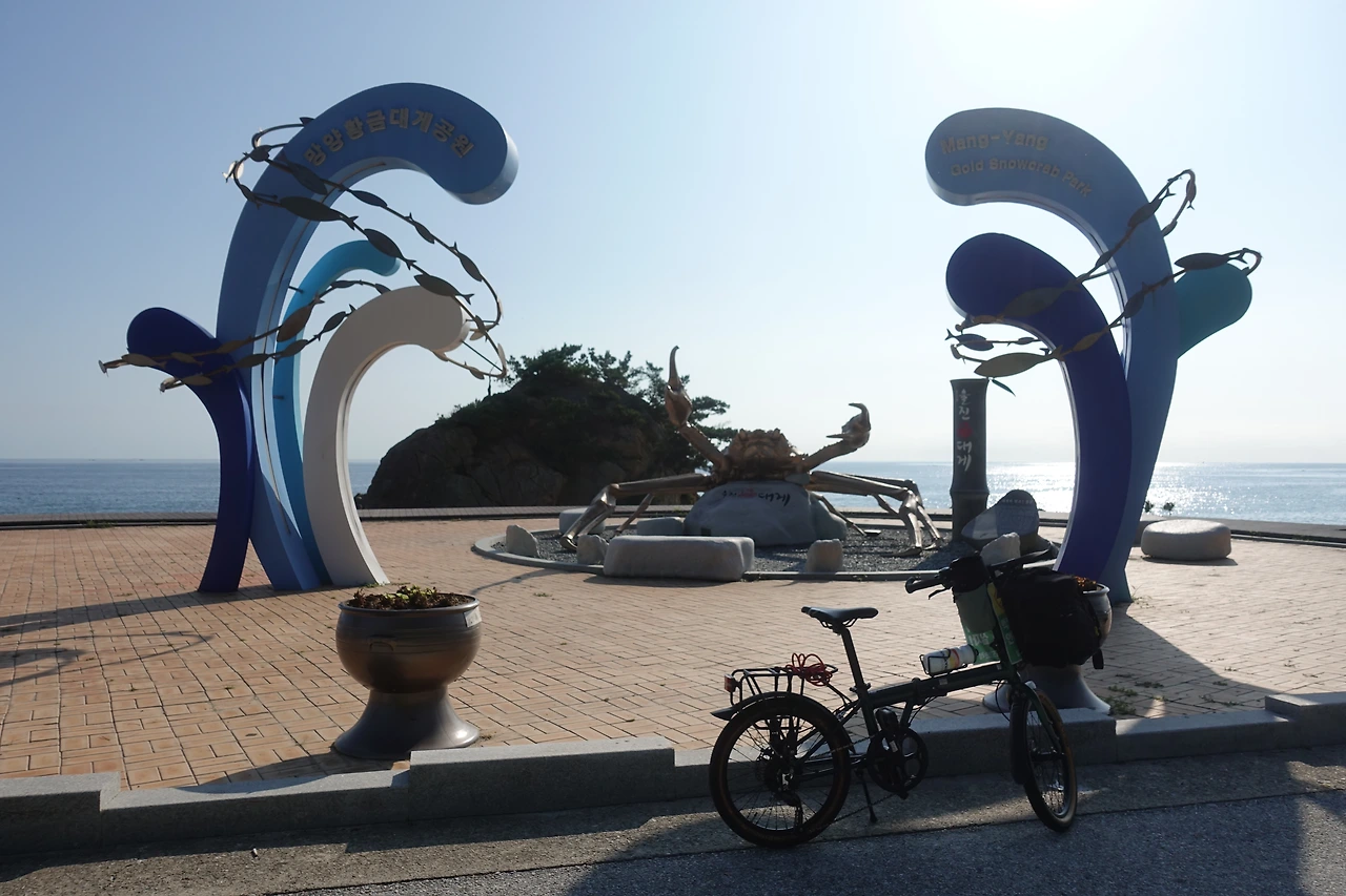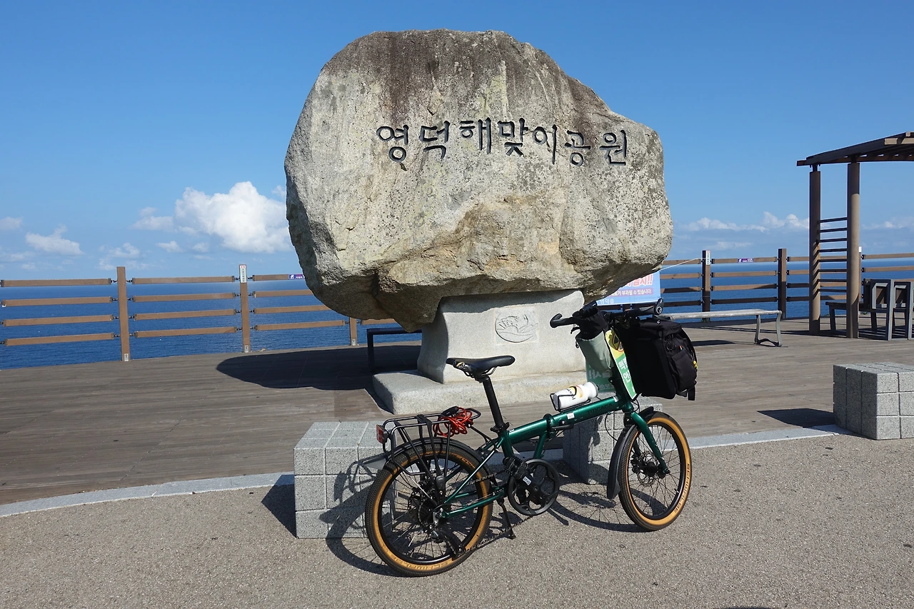 15:33 마침내 동해안 자전거길 경북 지점의 마지막인 영덕 해맞이공원이 나왔다. 오르막 끝 지점에서 매실 주스 한 병을 마시고 황분희 부위원장님께 전화를 했다. 목소리에 병색이 완연했다. 무슨 일인가 놀라서 여쭤보니 갤러리 오프닝 날 내려가시는 길에 식중독으로 병원에 입퇴원 후 여태 기운이 없다고 하셨다. 너무 죄송했다.