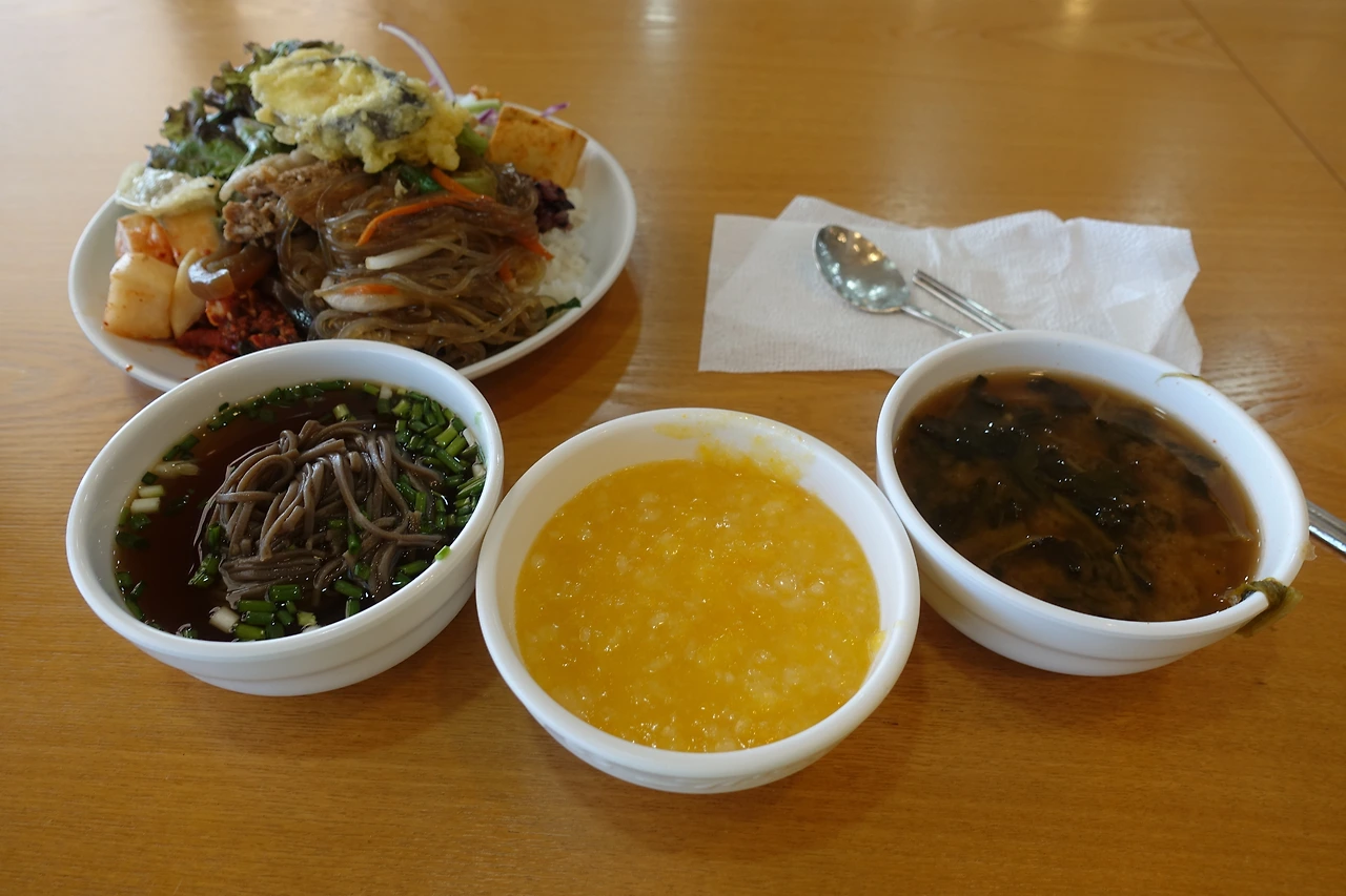 12:00 칠보산 휴게소에 도착했다. 4년 전 9,000원 하던 한식 뷔페는 12,000원 했다. 물가 상승률이 심각했다. 평소에 먹고 싶던 호박죽에 된장국과 밥, 메밀국수와 샐러드를 먹을 수 있었다. 두 칸 앞 테이블 노중년 여성들이 내 조끼를 보고 수군거리는 소리가 들렸다. 눈길을 끌었다는 점만으로도 성공이다.