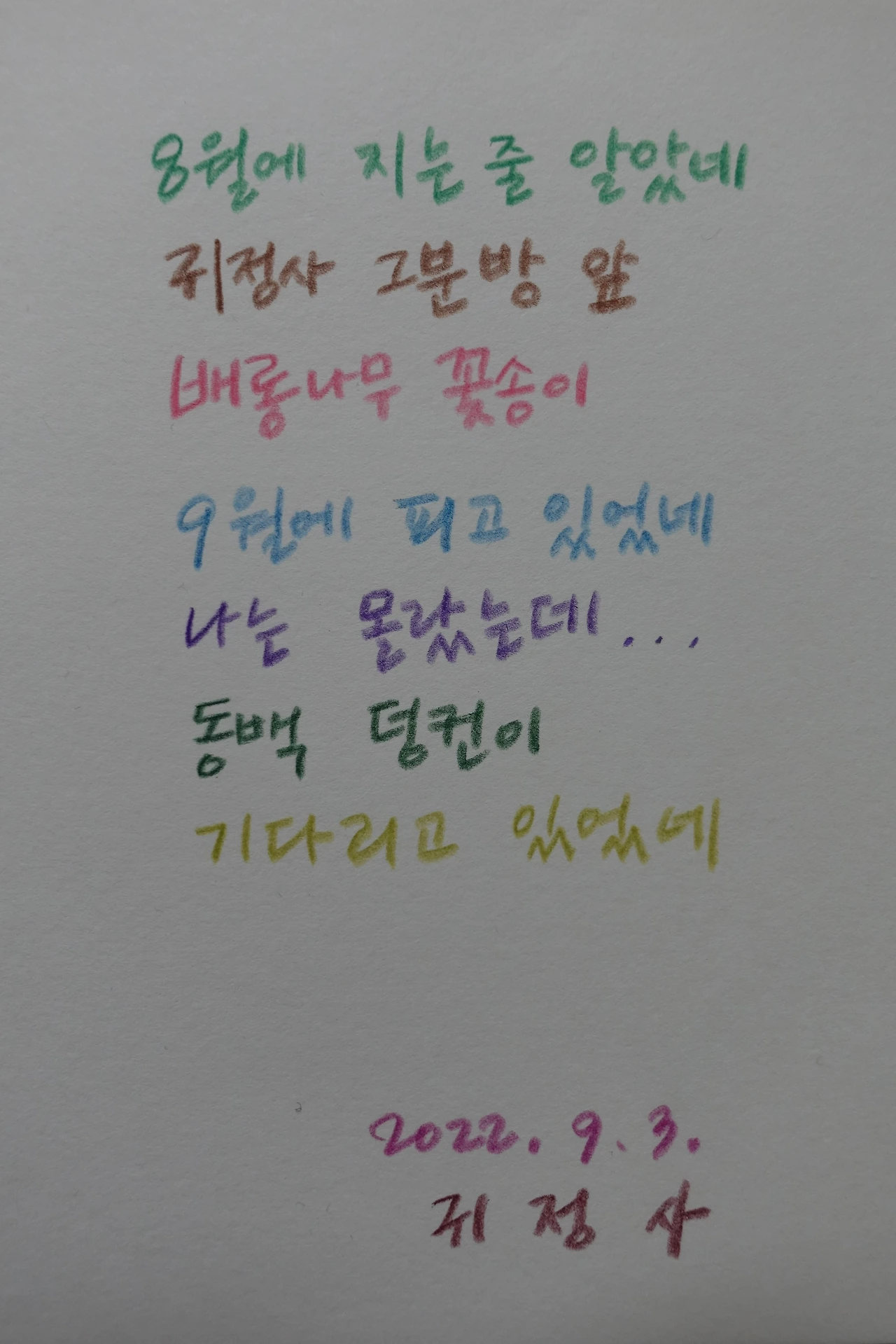 올해도 무와 배추를 심었고, 옷깃의 도움으로 하얀 앞치마를 손바느질로 만들며, 스태들러와 파버 카스텔과 함께, '푸른 옷소매'와 '남원시립김병종미술관'에서 보낸 아름답고 고운 시간도 있었다.