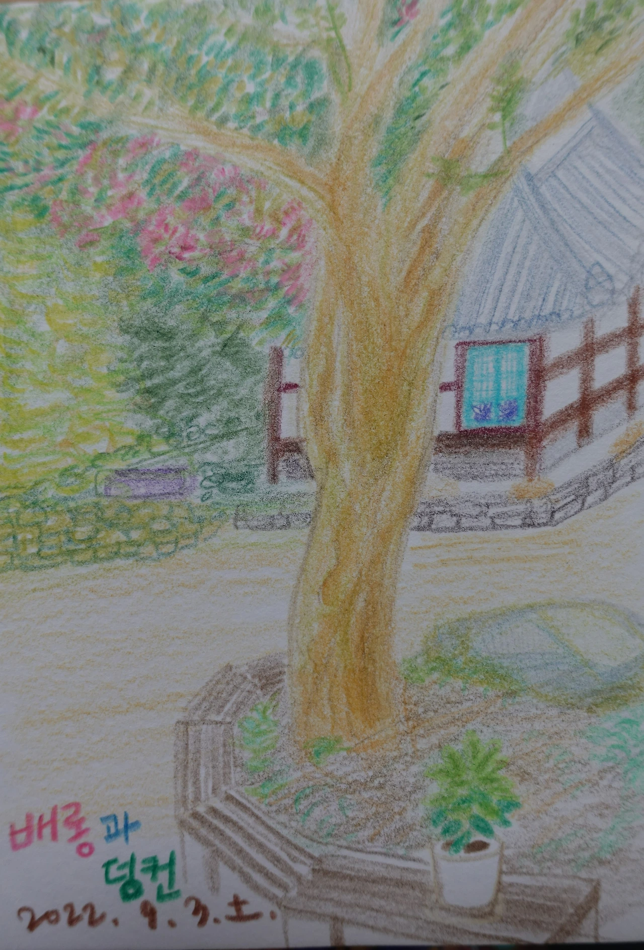 툇마루에 작은 상을 펴고 새로 산 A6 스케치북과 색연필을 꺼냈다.