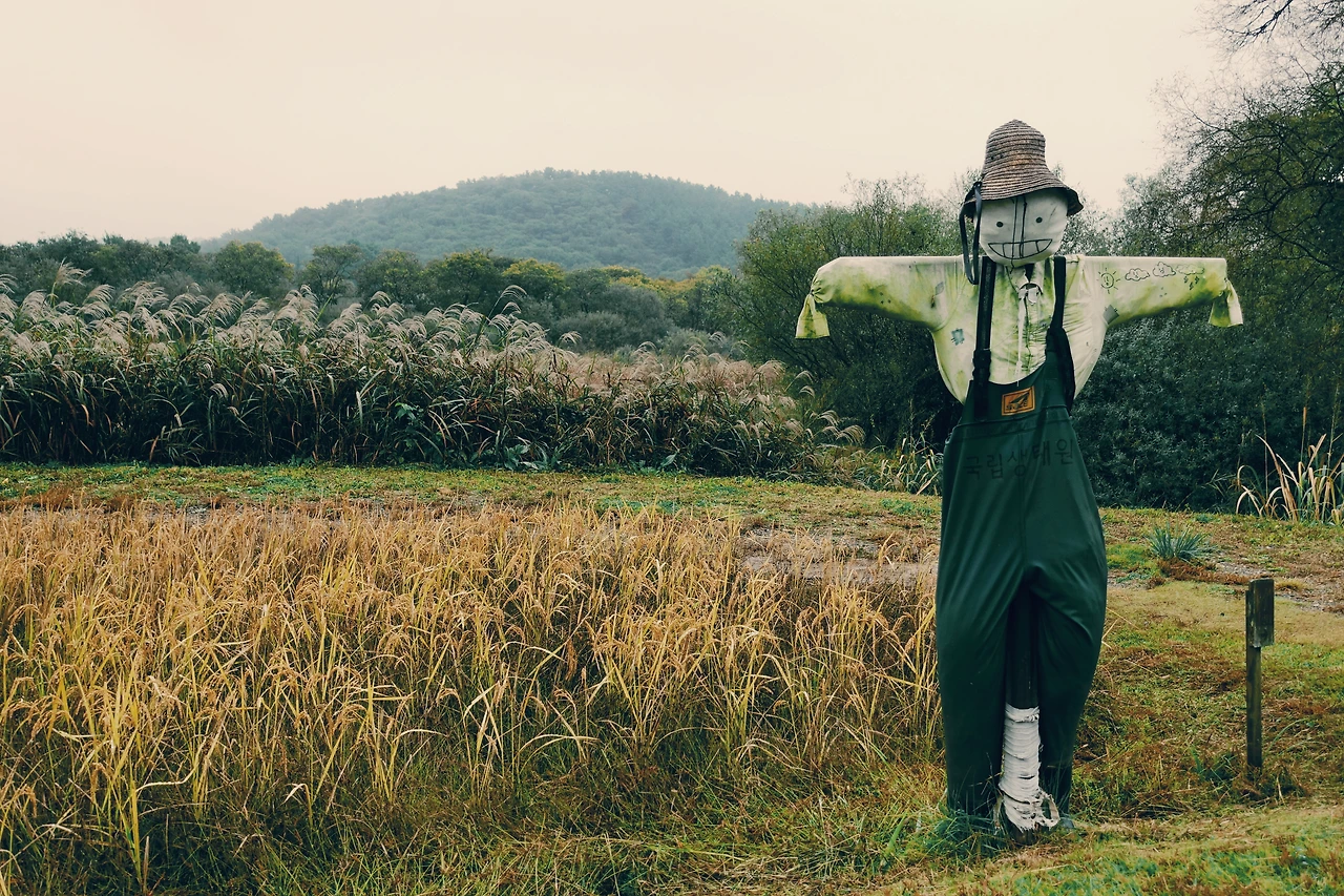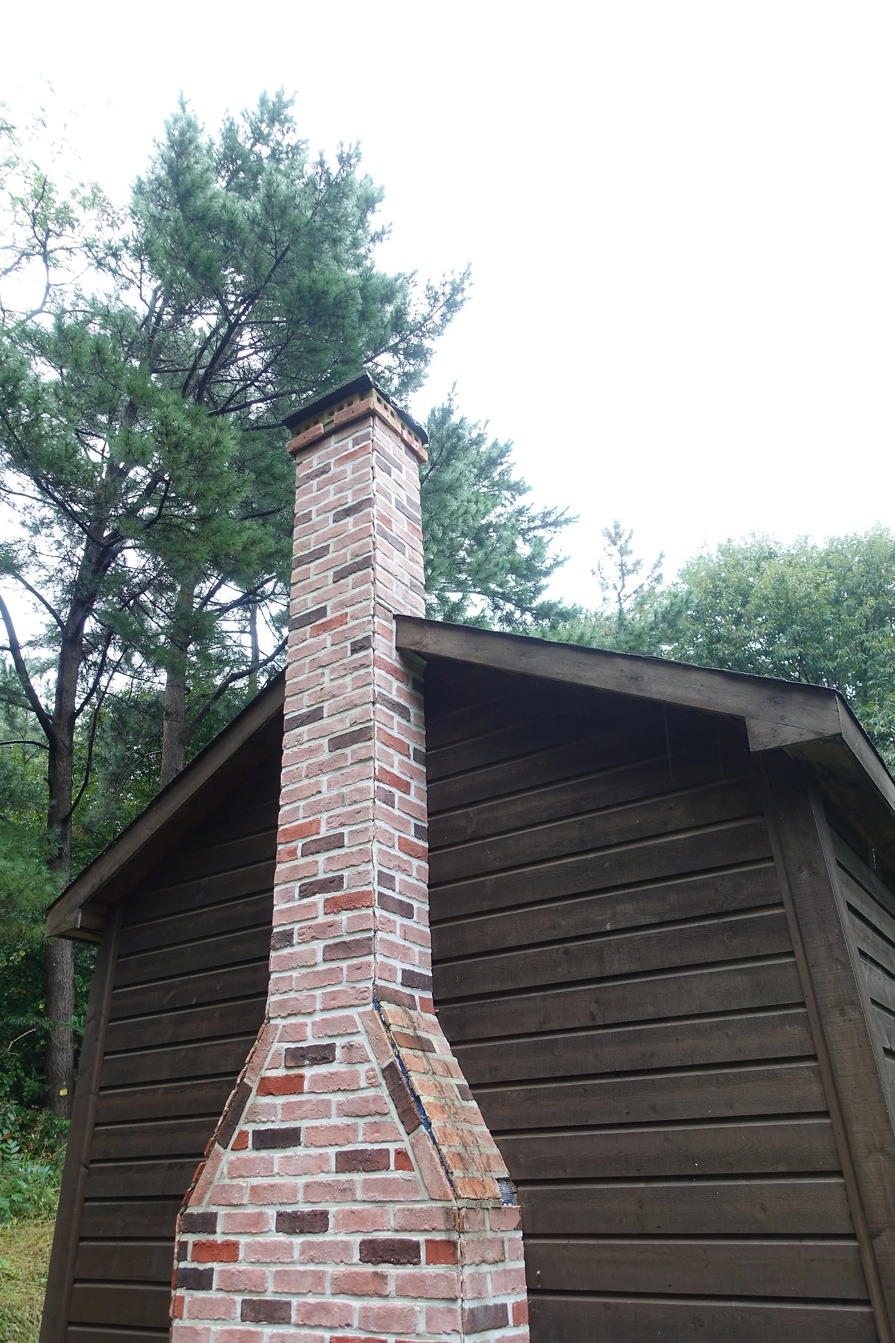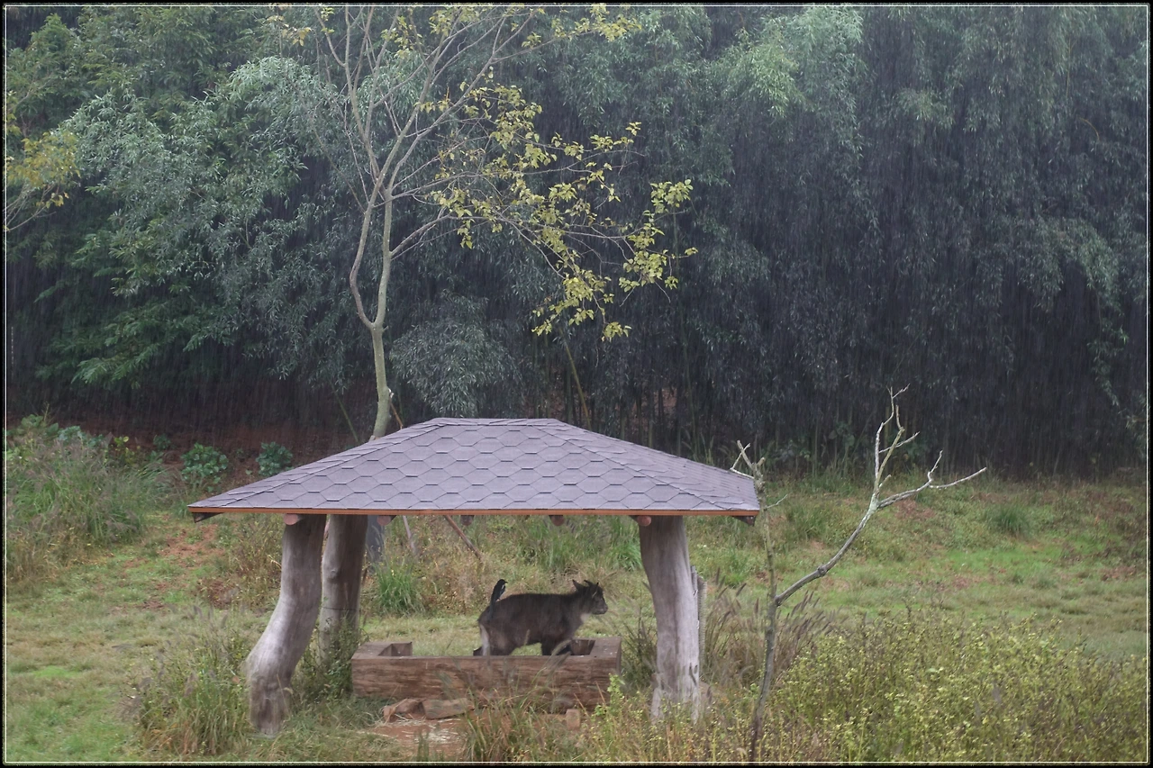 원두막 야트막한 담장 위에 있던 까치가 폴짝 뛰어올라간