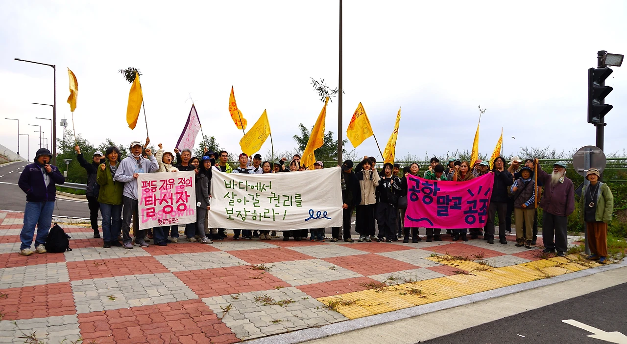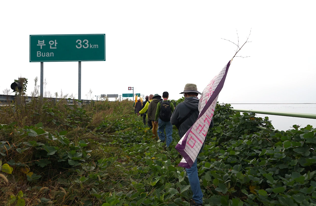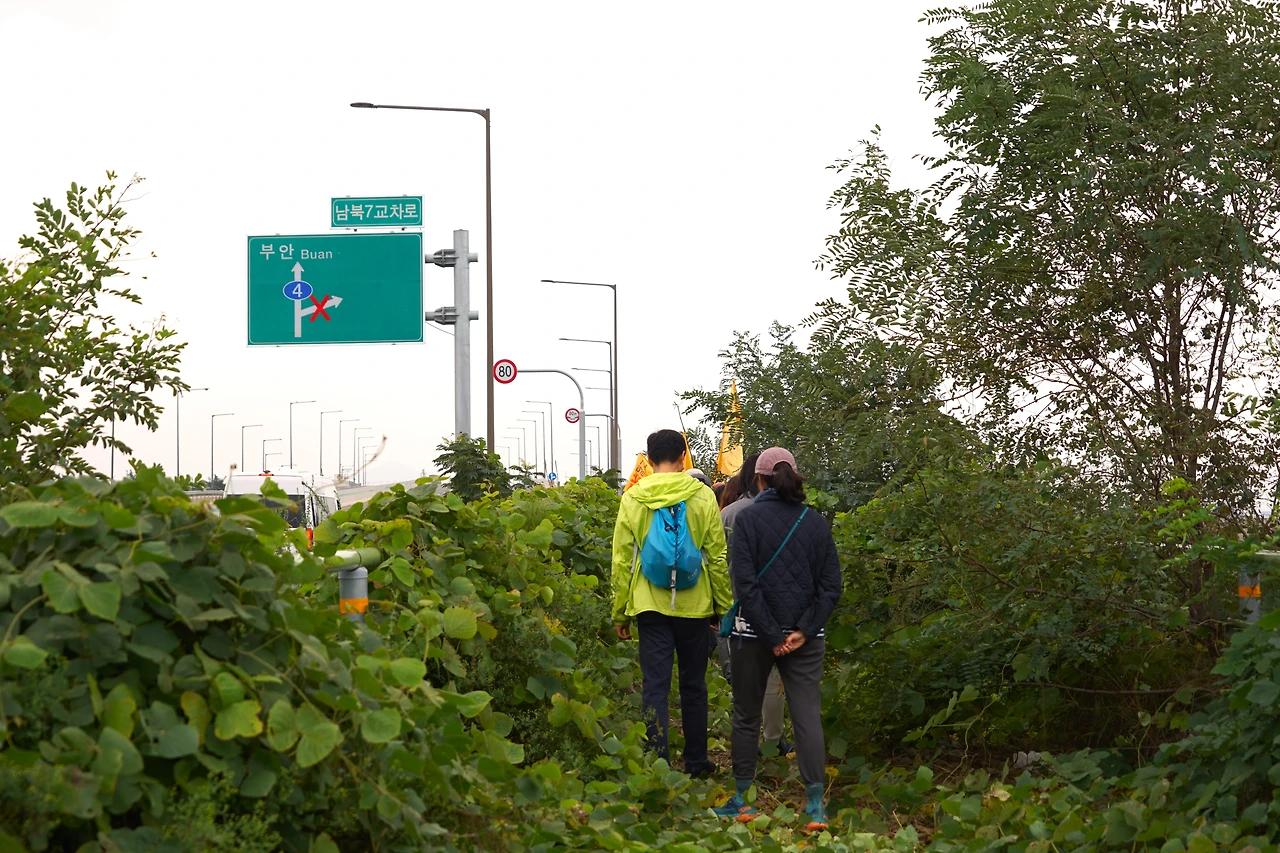 12시가 넘어 다리가 아플 때쯤 다리 밑에 앉았다. 점심 식사는 김밥이었다. 모든 식사에 채식주의자를 위한 메뉴가 있었다. 김밥 한 줄도 허투루 주문하지 않는 주최 측의 세심함을 느끼며 땅바닥에 앉아서 고급 김밥을 먹었다. 문정현 신부님과 더덕은 앉지도 못한 채 서서 김밥을 드셨다. 차 한 대 다니지 않는 길에 신호 없는 신호등과 역주행 금지, 좌회전 금지 등 온갖 금지 표지판이 설치돼 있었다. 이곳에서 금지할 것은 바다 생명을 죽이는 무분별한 개발뿐이었다.