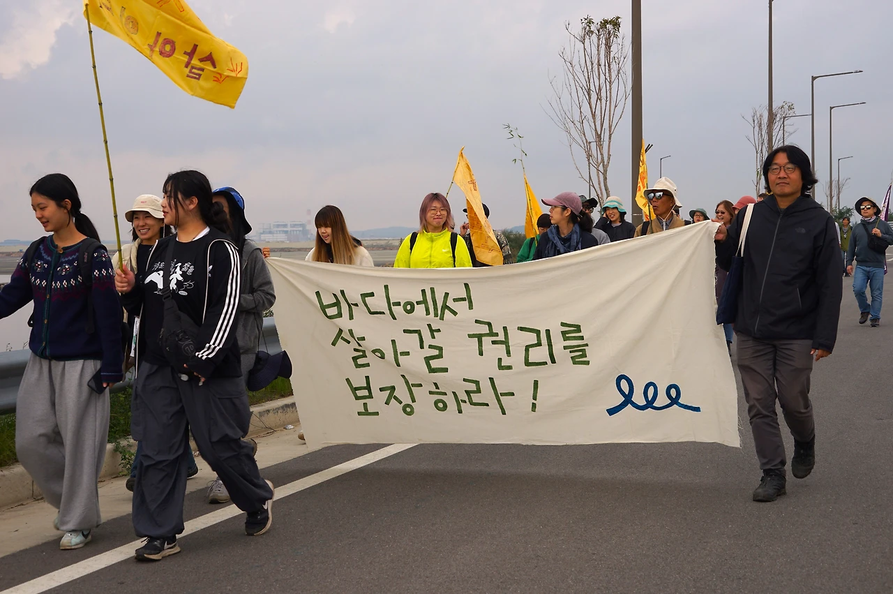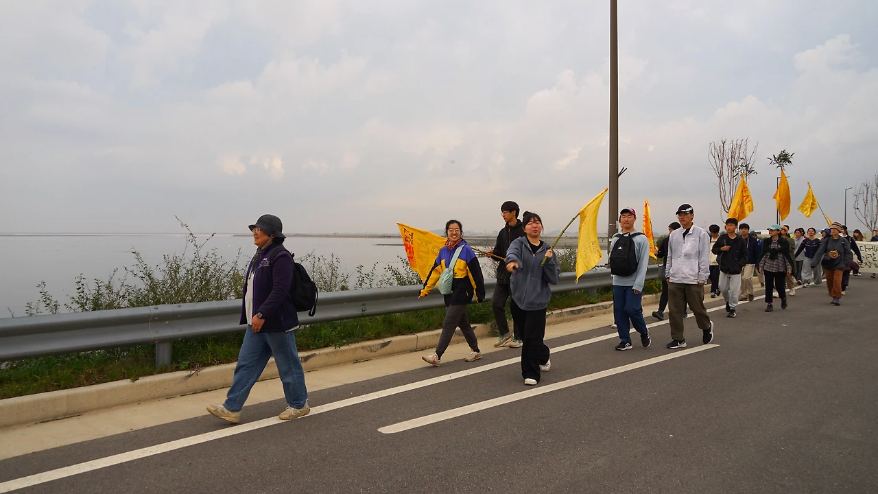 바람과 간청의 소리가 메아리처럼 번졌다. 그랬다. 살살 페스티발은 2007년에 하고 이번 2024년에 했으니 17년 만에 복원한 축제였다. 학생들이 태어나기 전부터 살리려고 했던 새만금 갯벌. 8천 년의 세월을 품은 갯벌, 그 갯벌을 살리기 위해서, 첫날 200명 넘는 사람들 과 함께 마당굿 운동 50년과 46회 팽팽문화제로 시작한 살살 페스티발은 둘째 날 수라갯벌을 지나 4㎞ 넘게 걸어 마른 해창갯벌에서 축제를 하고 셋째 날 원형에 가까운 해창갯벌에 발을 담그며 생명을 마셨다.