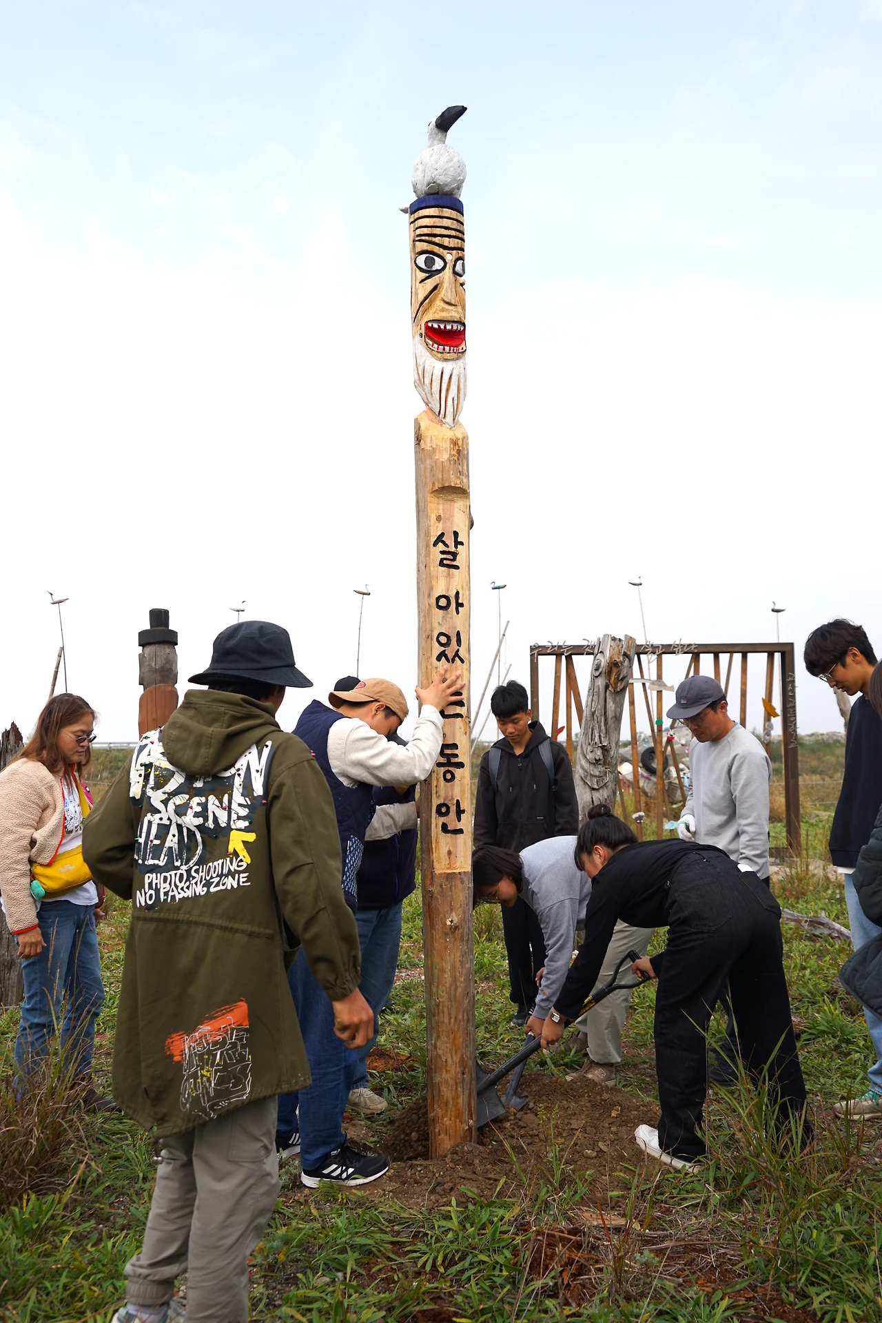 해창갯벌의 생명을 온몸으로 느낀 모두는 미사 장소로 돌아왔다. 그리고 다녀오는 동안 신부님과 친구들이 완성한 장승을 세웠다. ‘살아있는 동안’. 올해 평화바람 달력 제목이었다.