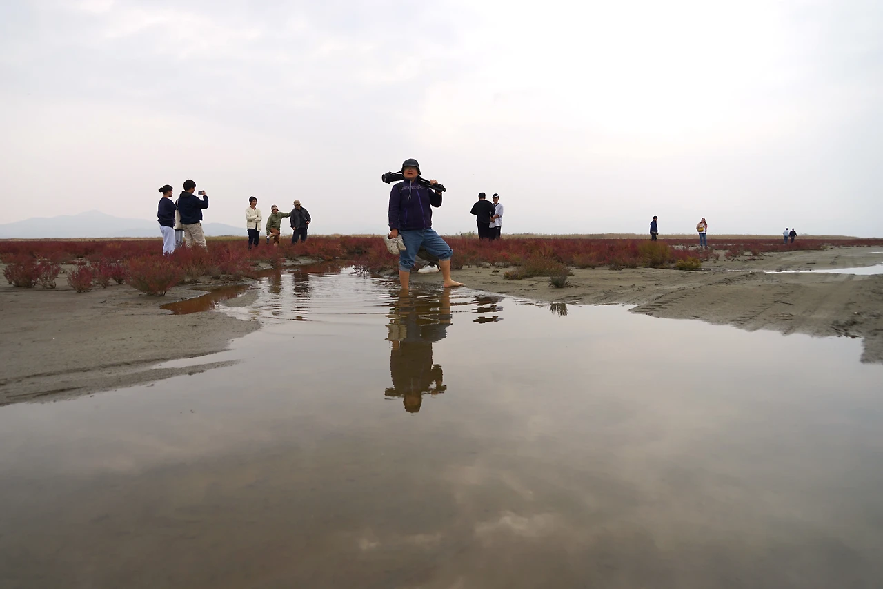 붉은 갯벌이 펼쳐졌다. 염생식물인 퉁퉁마디와 해홍나물. 그 너머에 새들이 가득했다. 그곳은 발목 차는 바다였다. 장화를 신은 사람들과 벌써 맨발인 사람들이 많았다. 나는 갯벌에 사람이 들어가면 어떤 식으로든 생명이 해를 입을 거로 생각해서 처음부터 신 벗을 생각을 하지 않았다. 그런데 갯벌과 바닷물이 만나는 곳까지 들어가서 신발이 진흙 범벅이 된 후에야 뒤늦게 마음을 먹었다. 8년 전 스페인 산티아고에서부터 수천 킬로미터를 걸어와 뒤꿈치가 너덜너덜 찢어진 등산화를 벗고 양말도 벗어 그 안에 넣었다. 남루함을 벗고 말쑥해진 하얀 발이 시커먼 갯벌을 디뎠다. 갯벌과 만나고 싶었다. 영화 <아바타>에서 존재가 존재를 만날 때 하던 대사 “I see you.” 나는 당신을 봅니다, 처럼.
