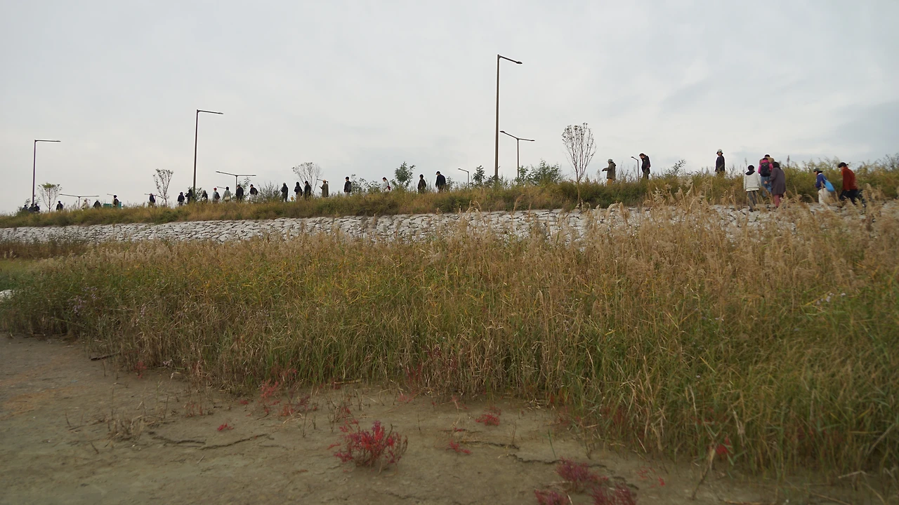 차를 타고 북쪽으로 올라갔다. 큰길에서 벗어나 새만금환경생태단지 지나 좁은 길을 달렸다. 멀쩡한 갯벌을 메워 건물 세워 놓고 생태단지라니 바다를 흙으로 메꾸는 데 몇 개의 산을 파괴했을까? 갯벌을 메웠지만, 농지로 쓸 수 없어 녹지를 만들려고 소먹이 풀 이탈리안 라이그라스를 심어놓았다는 곳을 지난 듯했다. 멈춰선 그 길옆에 억새와 풀이 어찌나 수북하고 가득한지 그 길로 내려가는 입구부터 음악 없는 뮤직비디오를 찍는 듯했다.