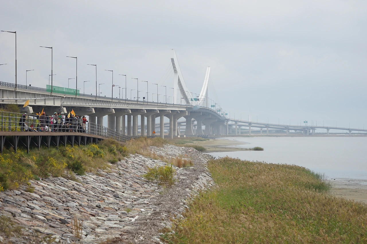 앞에 가던 오동필 새만금시민생태조사단장이 일행에게 설명하는 소리가 들렸다. 씨앗의 힘은 얼마나 끈기 있는가. 갯벌의 품은 얼마나 포근한가. 갯벌에 흙이 쌓여 습지가 되었다. 바다에서 커다란 나무가 자란다. 방조제와 방수제 사이에 하얀 바닥이 아름다운 이유는 나무와 풀과 새가 살고 있기 때문이었다. 점점 땅이 되어가고 있는 바다. 그래도 살아남아 고맙고 슬픈 바다. 갇힌 바다가 아름다운 풍경을 드러낼수록 걷는 발걸음은 무거워졌다. 오후 한 시 반쯤 만경대교를 바라보며 도보순례는 끝났다.