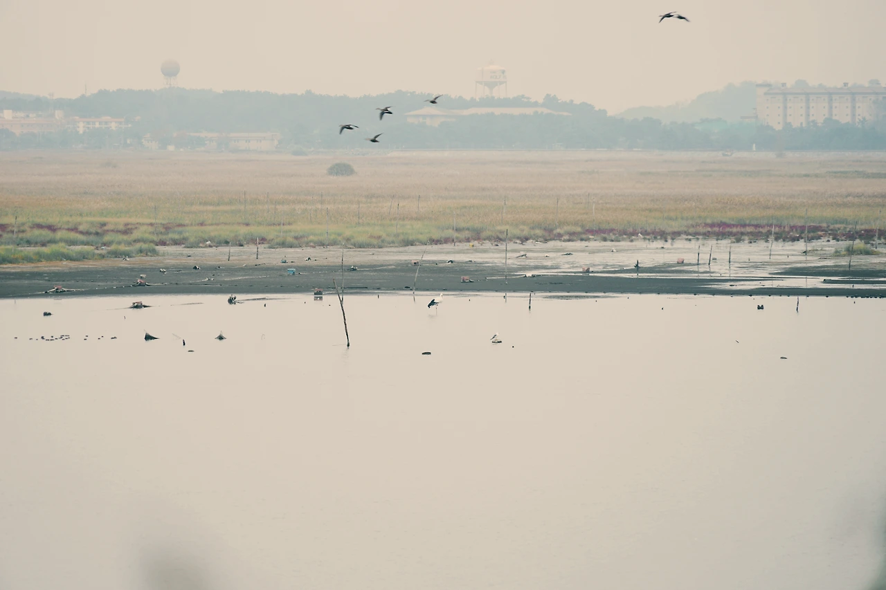 차를 타고 남북로로 이동했다. 미군기지와 군산공항과 남북로 사이에는 갯벌이 있다. 영화로 유명해진 ‘수라’. 그 수라갯벌로 내려가 보았다. 새만금 방조제에 이어 남북로로 칭하는 4번 국도로 두 번이나 바다가 막힌 수라갯벌은 놀랍게도 살아있었다. 물기만 있는 차진 갯벌엔 퉁퉁마디와 해홍나물과 억새 등이 뿌리내리고 있었고, 저 멀리 얕은 물에는 황새와 다른 종류의 새들이 있었다. 하루 두 번 해수 유통으로 수라갯벌은 간신히 숨을 쉬고 있었다.