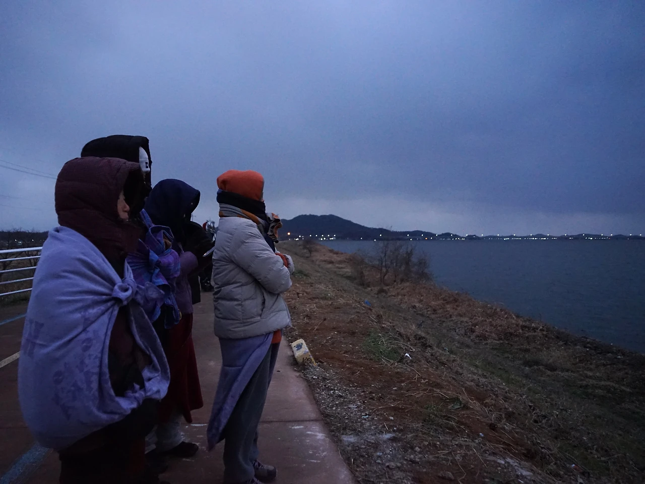 날은 흐리고 해는 벌써 사라졌다. 잠시 후 강 건너에서 시커먼 그물 같은 윤곽이 하늘로 날아올랐다 내려갔다 또 올라 사라졌다. 금강은 거침없이 흐르니 철새들이 50만 마리씩이나 와서 쉬었다 간다. 새만금이 틀어막고 있는 만경강과 동진강은 어찌해야 할 것인가. 그러고 보니 지난 4월 세월호 참사 10주기 순례했던 영산강도 하구둑으로 막아 놓았었다. 지류도 아니고 거대한 강을 바다와 닿는 곳에서 막는 인간들의 머릿속이 궁금하다.
