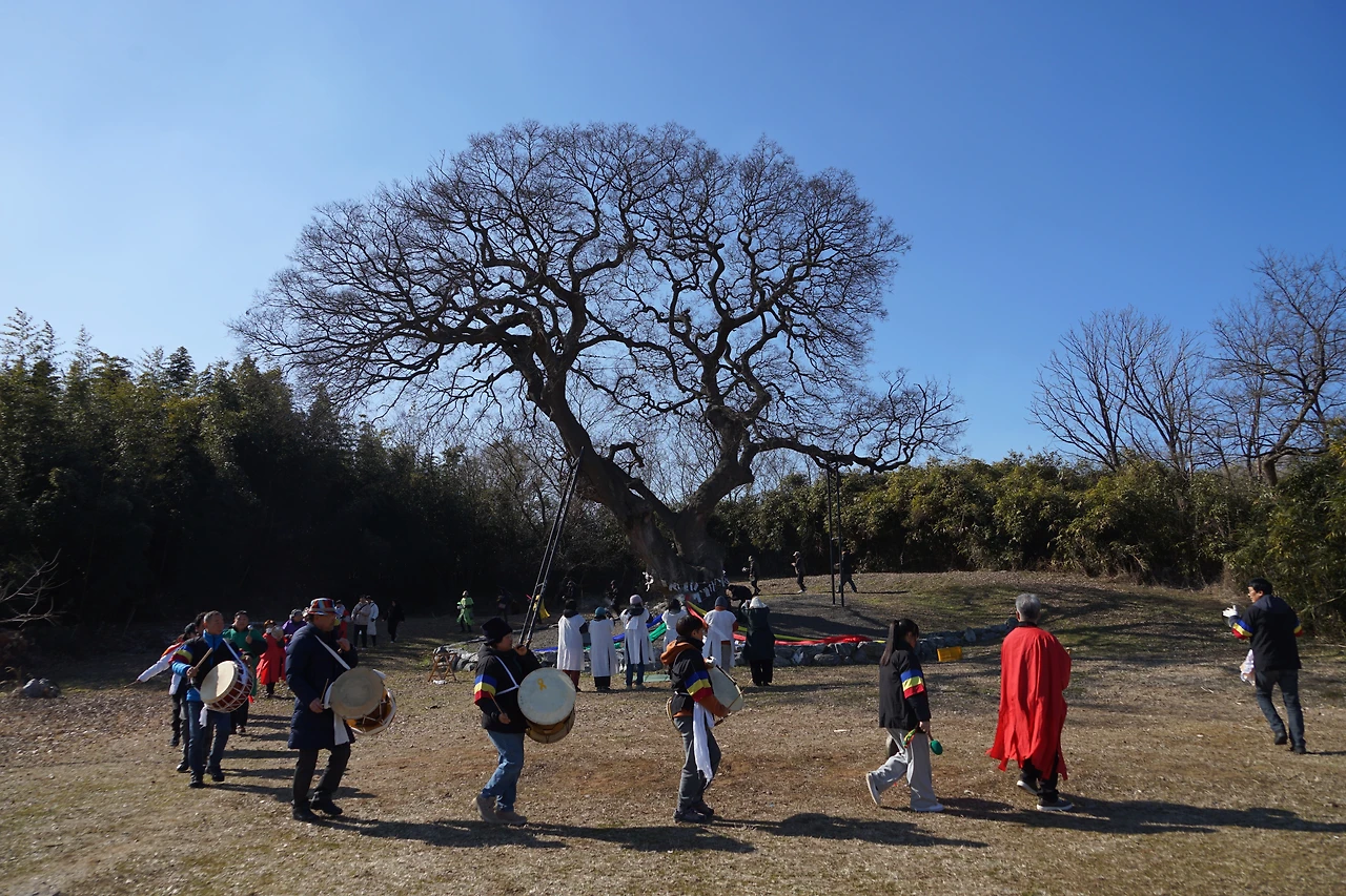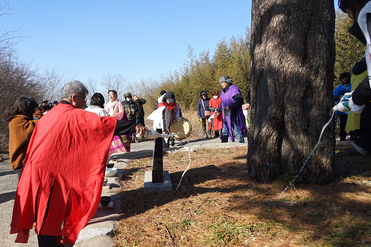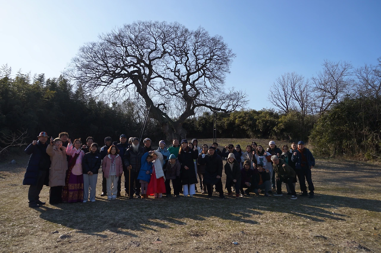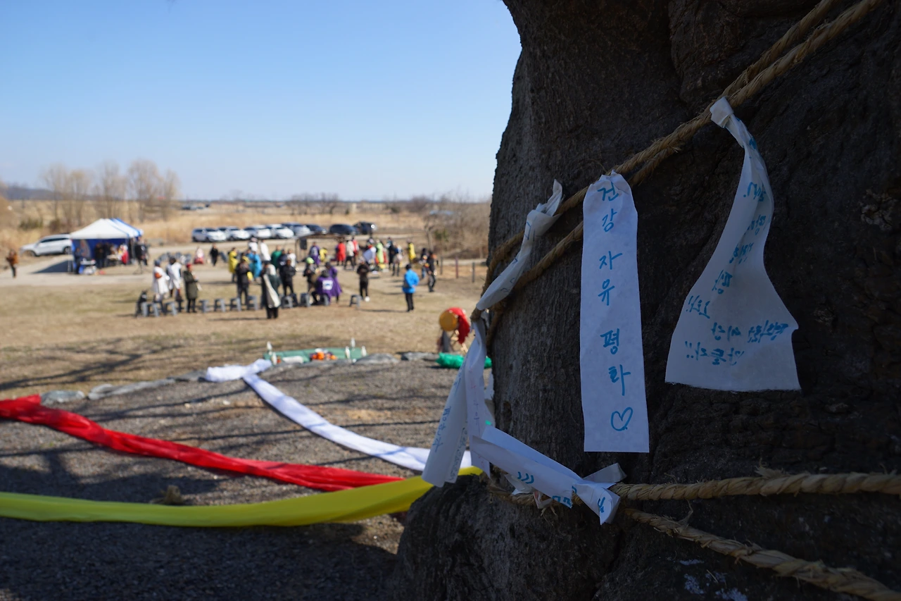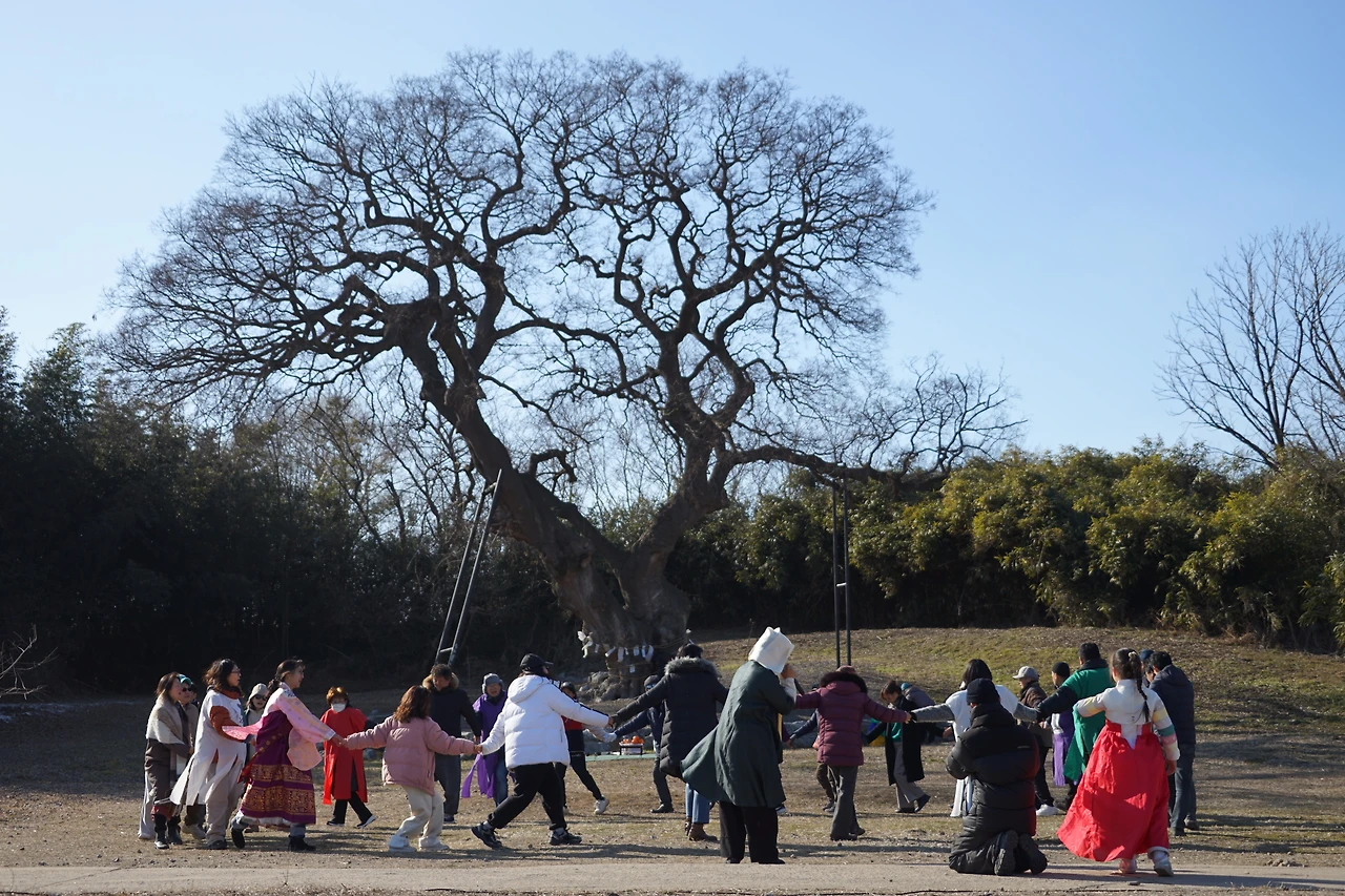 600살 팽나무는 소원지를 끼운 새끼줄을 낮은 허리에 두른 채 서 있었다. 이날 한복을 입고 오라고 해서 철릭 치마를 입고 갔는데, 그냥 온 사람들은 알록달록한 옷을 덧입고 있었다. 도깨비 복장이었다.