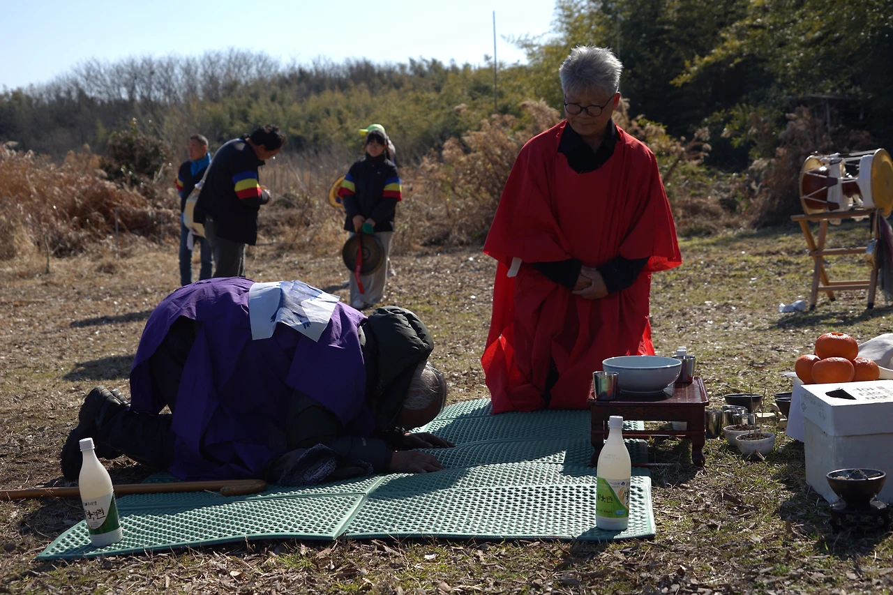 올해 2월 12일이 음력 정월 대보름이었다. 열흘 지났지만 팽나무에게 대보름 맞이를 했다. 먼저 신부님이 절을 하시고 이어 참가자들이 절을 했다. 소지를 날리고 풍물이 시작되었다.