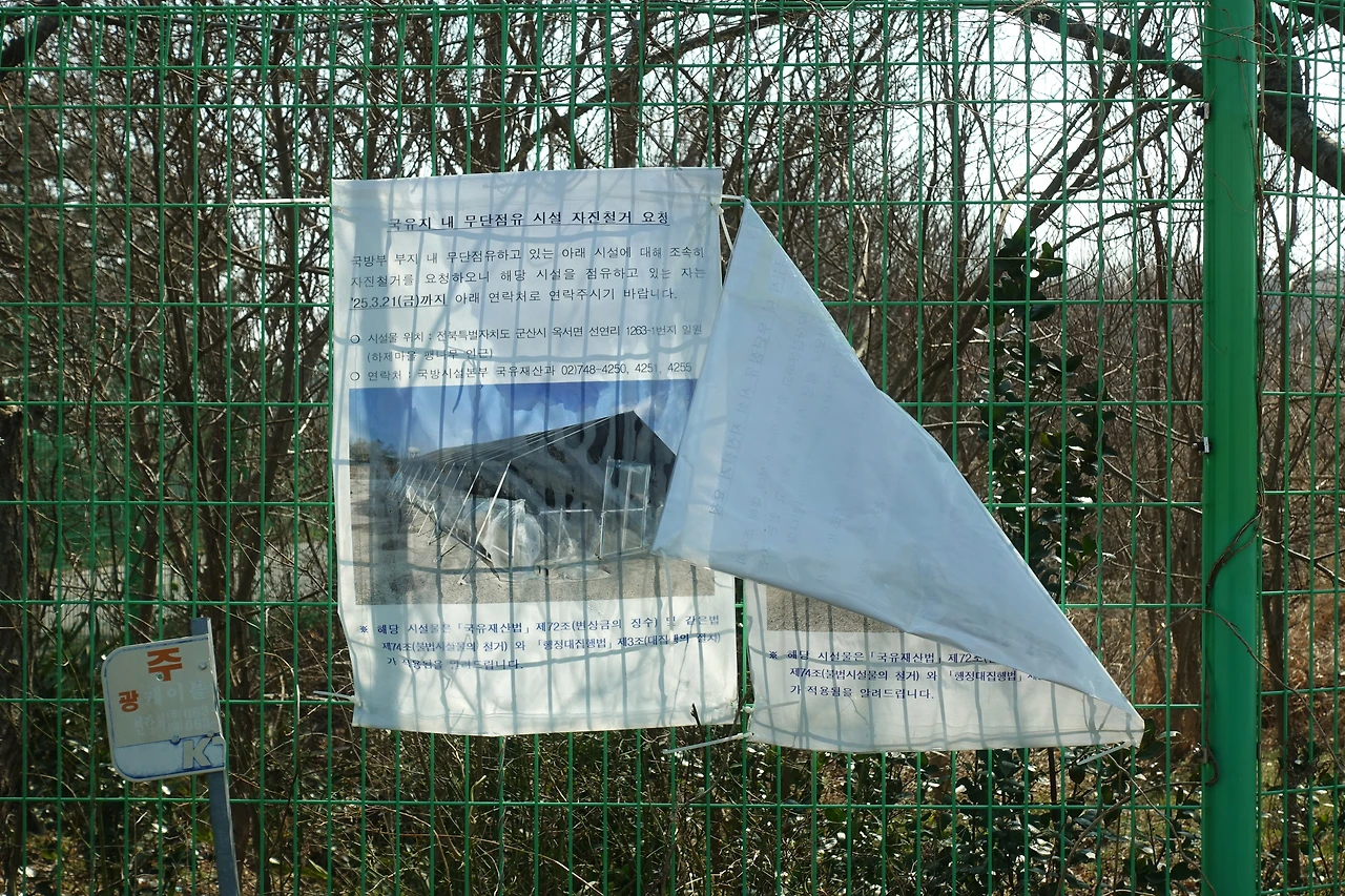 문 옆에 안내문이 붙어 있었다. 지난달엔 그냥 지나쳤지만, 이번엔 한 번 읽어보았다. 국유지 내 무단점유 시설 자진철거 요청 즉, 안쪽 비닐하우스를 철거하라는 내용이었다. 그 비닐하우스에는 팽나무와 함께하는 사람들의 역사가 전시되어 있었다.