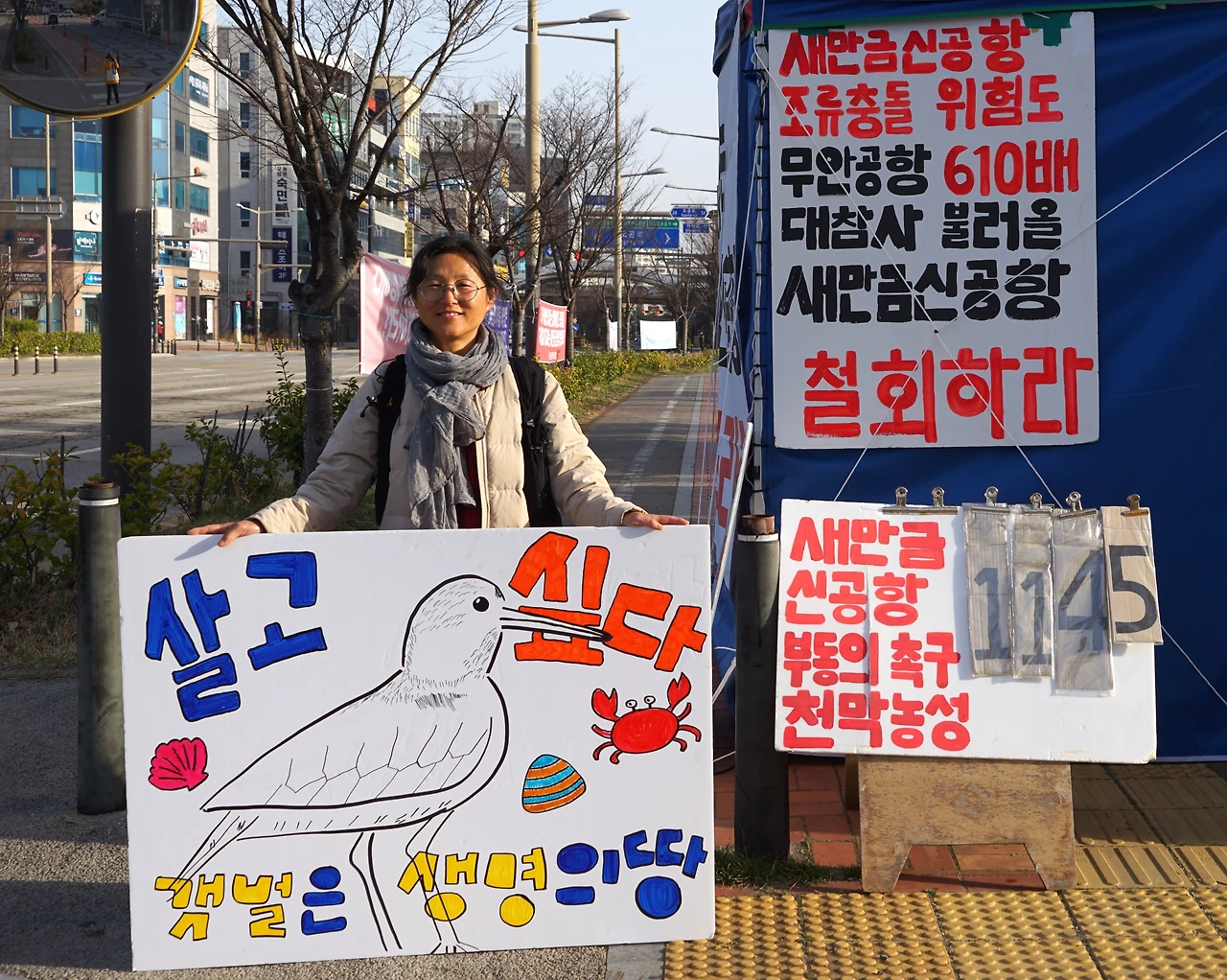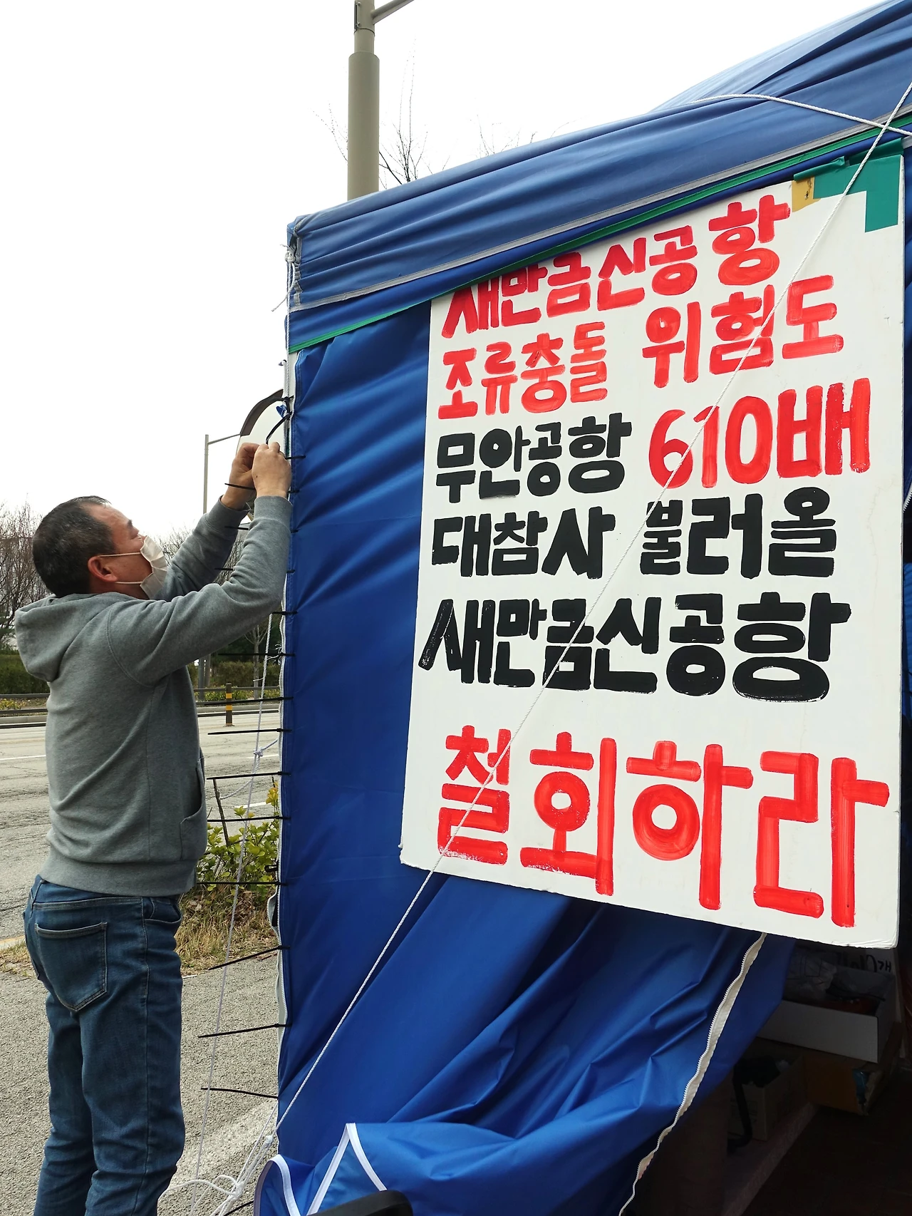 지난 2월 7일부터 삼일절까지 한국옵티칼하이테크 희망 뚜벅이 구미에서 서울 350km 23일 중 9일간 142km를 걷고 나서 열흘간 르포를 완성했다. 이미 진은 다 빠졌고 또다시 닷새간 수정을 하고 있는데 전화가 왔다. 청명이었다. 세종시에서 하던 천막 농성장을 새만금 신공항 환경영향평가 부동의 촉구를 위해 전주 전북지방환경청 앞으로 옮겼다고.