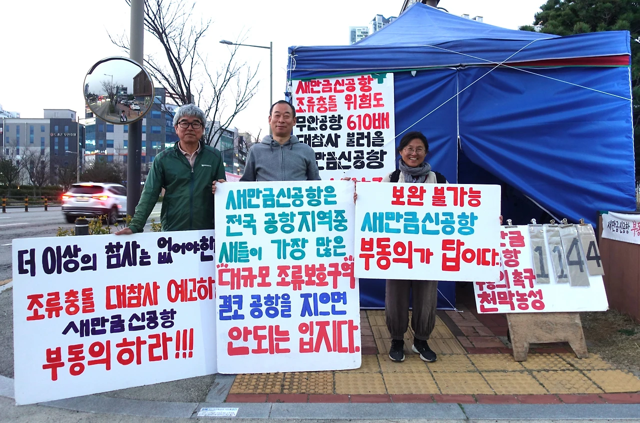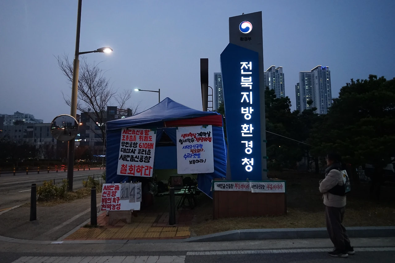새만금 신공항 백지화공동행동은 2022년 2월 6일부터 세종시 국토교통부·환경부 앞에서 3년 넘게 새만금 신공항 철회 촉구 천막농성을 이어왔다. 그런데 2025년 2월 25일, 국토교통부 서울지방항공청이 새만금 신공항 환경영향평가서 본안을 협의기관인 전북지방환경청에 접수했다. 전북환경청이 이 평가서에 부동의하면 새만금 신공항 계획은 철회된다. 그래서 3월 11일부터 전주에 있는 환경청 앞으로 천막을 옮겼다.