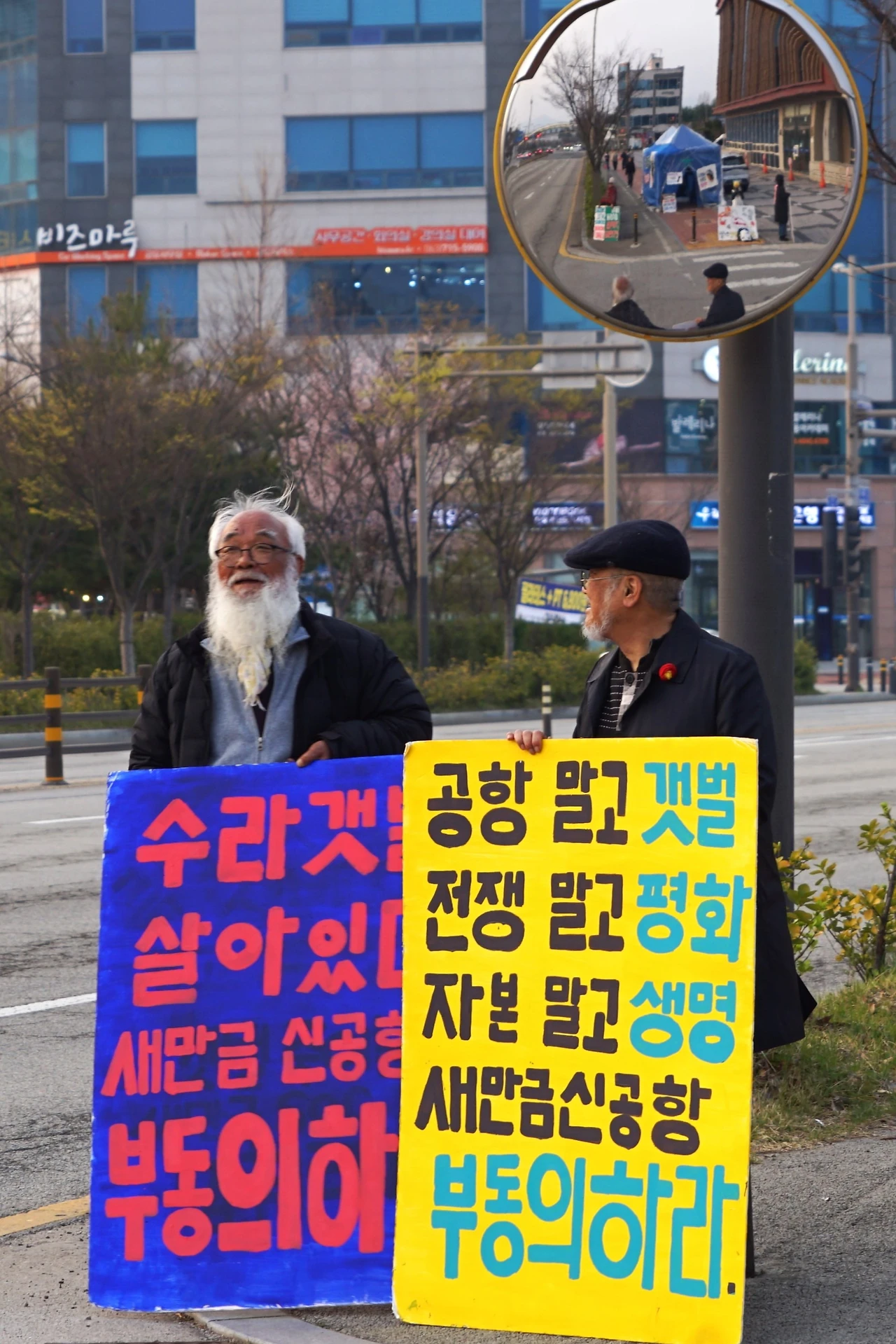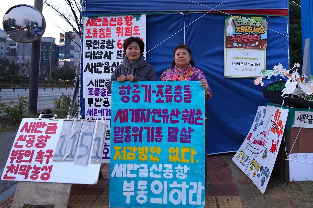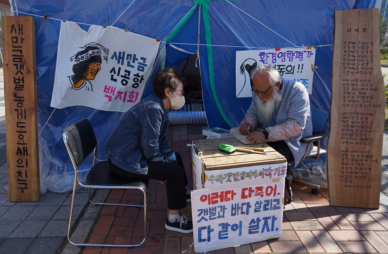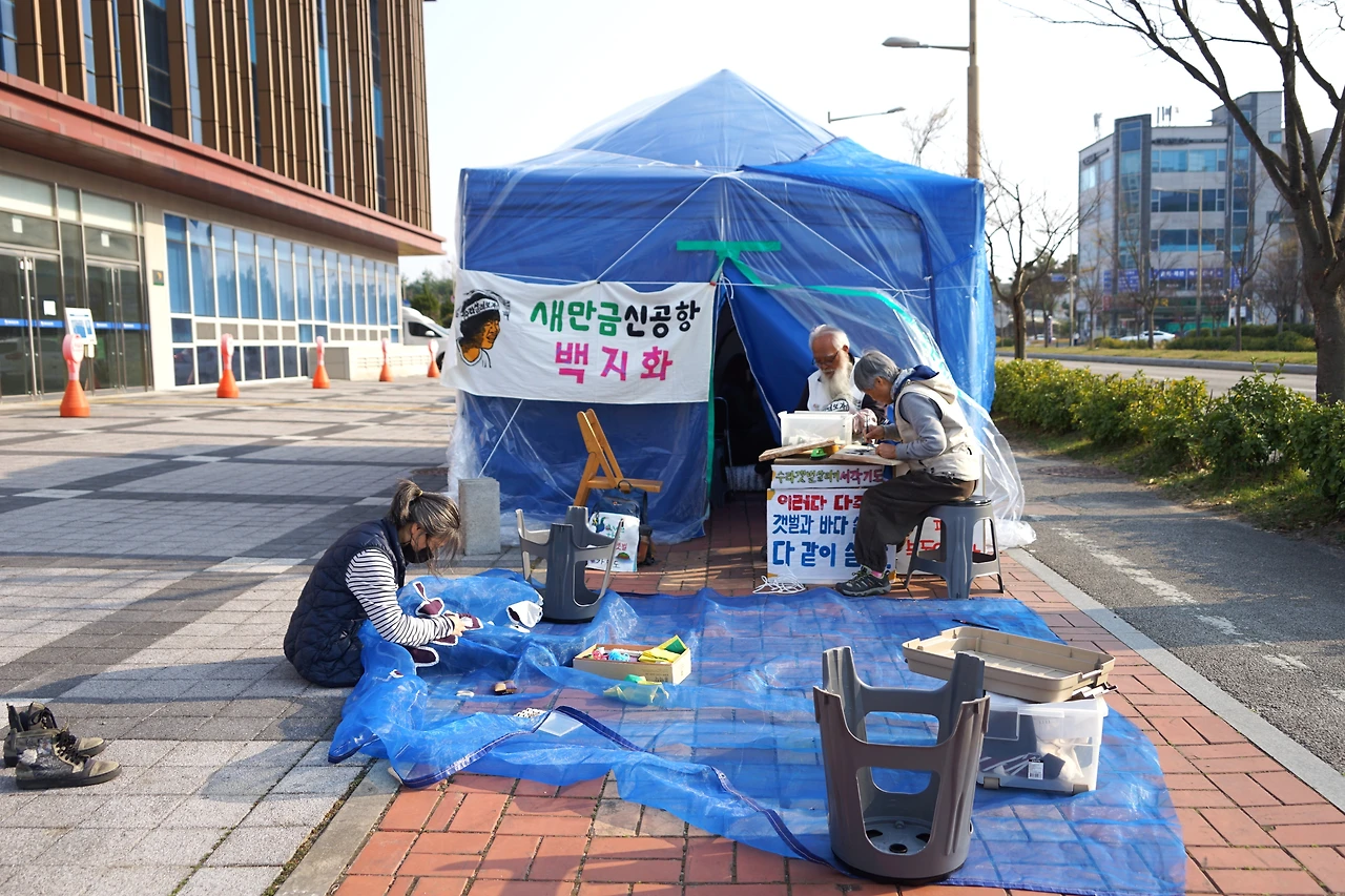밤이 되자 한 젊은이가 인스타그램을 보고 천막 밤샘 농성하러 왔다. 덕분에 군산과 전주에서 보따리 싸 오신 연세 있는 분들이 귀가하실 수 있었다. 연대가 점점 확장되고 있다. 새만금신공항 사업은 철회해야 한다. 수라갯벌은 보존되어야 한다. 생명은 살려야 한다.