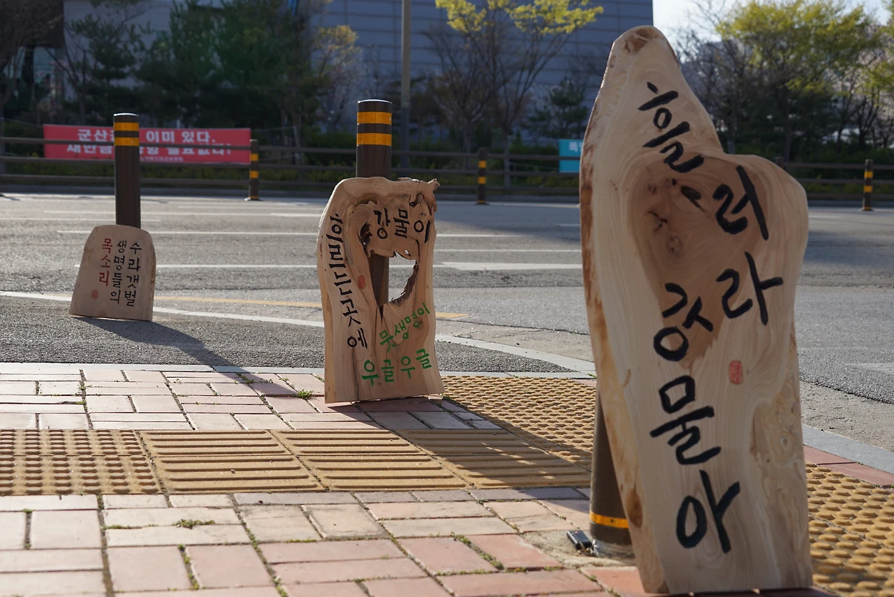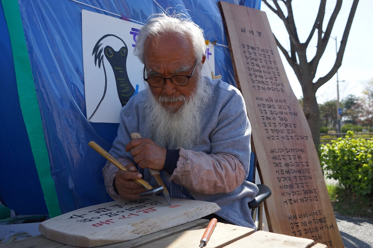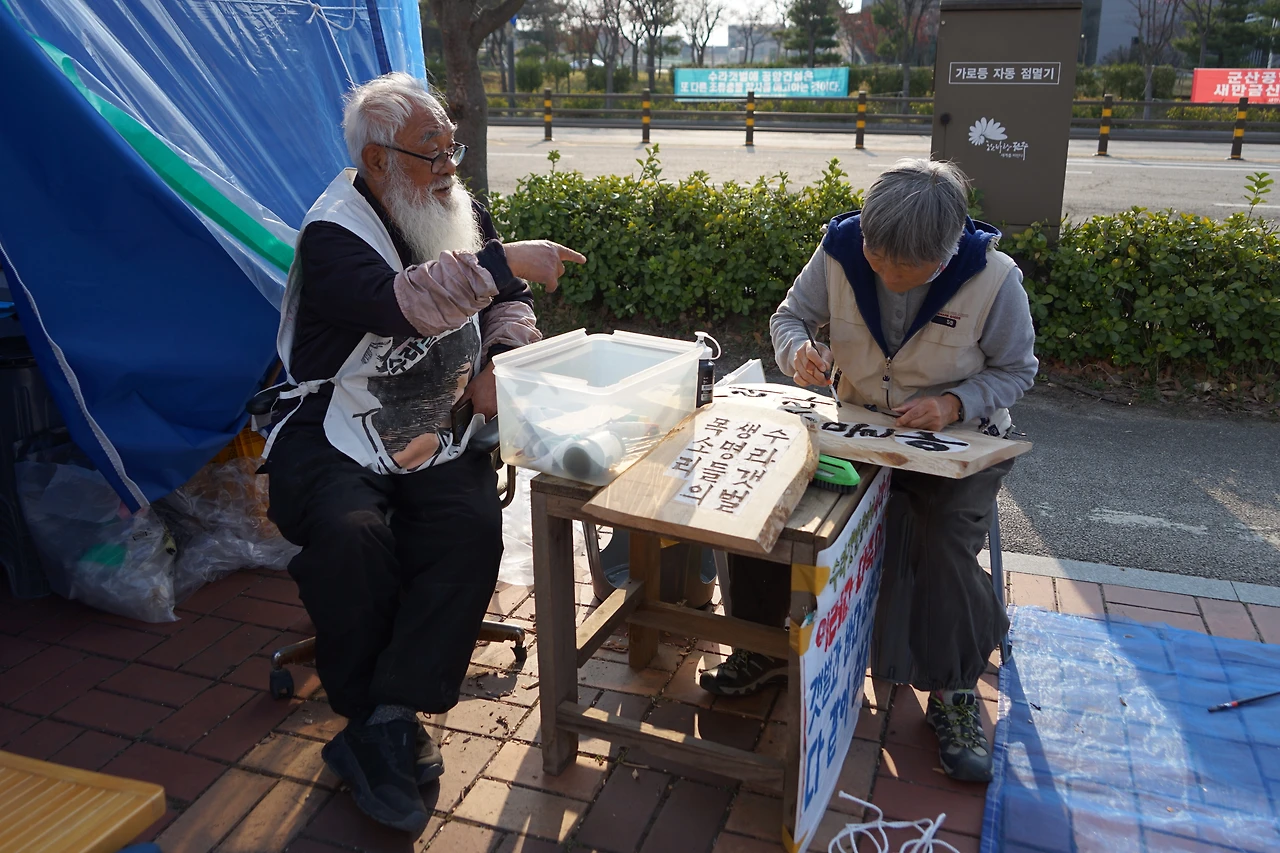 월요일 수업을 하고 화요일에 전주로 달려갔다. 만우절 거짓말처럼 구순에 가까우신 문정현 신부님이 새만금신공항 백지화 천막 맞은편 환경청 앞길에 새로 친 천막 앞에 앉아계셨다. 그 앞에는 두꺼운 목재가 놓여 있었다. 문정현 신부님 서각기도 작품이 될 나무들이었다. 천막과 보도블록을 달군 따사로운 오후 햇볕 아래에서 완두는 서각 글씨에 검은 아크릴 물감으로 칠을 하고 있었고, 더덕과 마후라는 땅바닥에 털썩 앉아 고기 잡듯 그물에 글씨를 바느질로 덧대고 있었다. 장기 농성을 하자면 일감이 있어야 한다는 전문시위꾼들의 방식이었다.