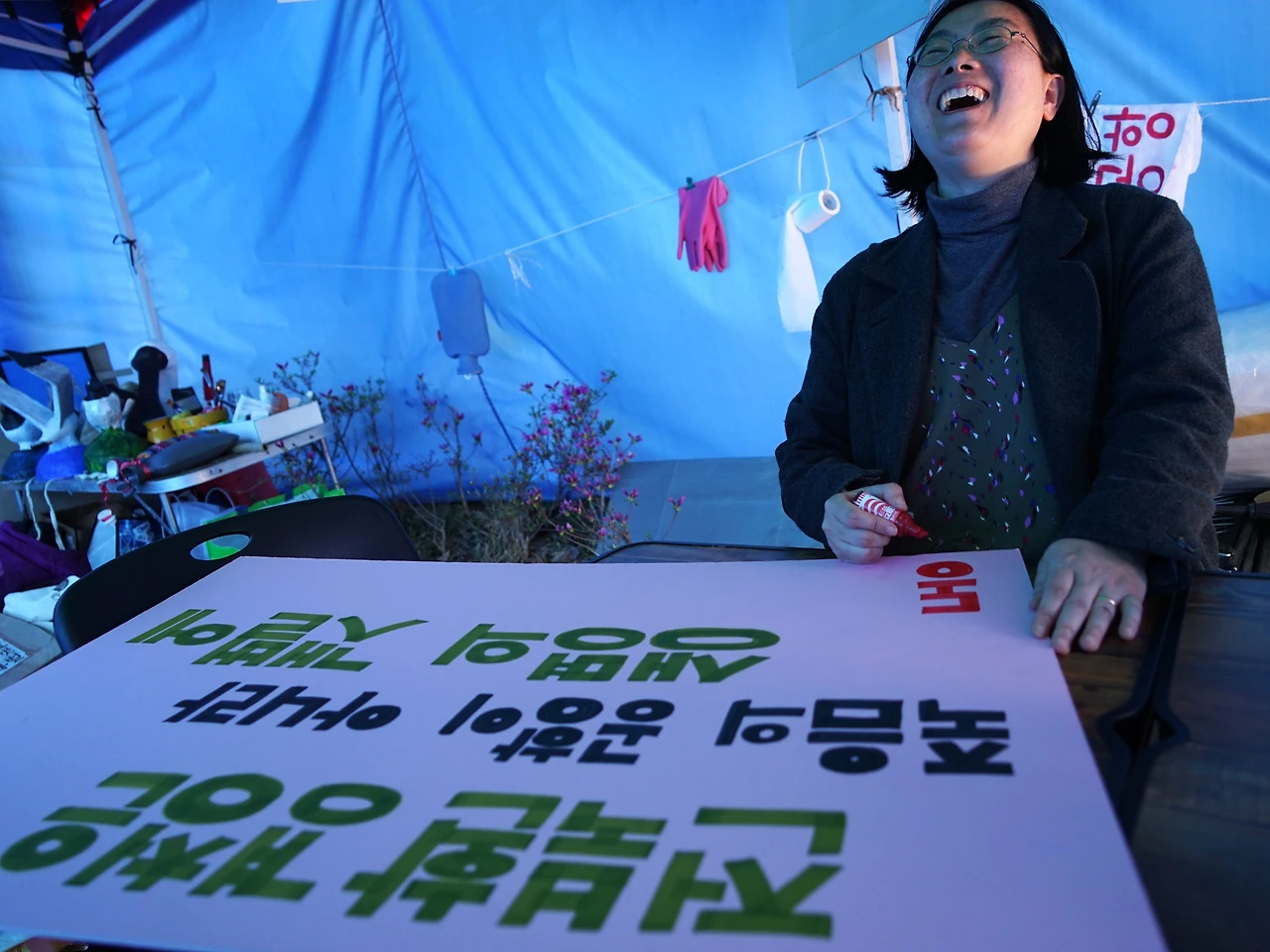 저녁 6시가 가까워지자 전날 밤새 천막을 지킨 완두는 철수하고, 마후라와 먼저 있던 이들은 탄핵을 외치러 각자의 지역으로 향했다. 곧이어 대전에서 데모 자매 은실과 명이가 왔다. 1151일 차 밤 천막 당번이었다.