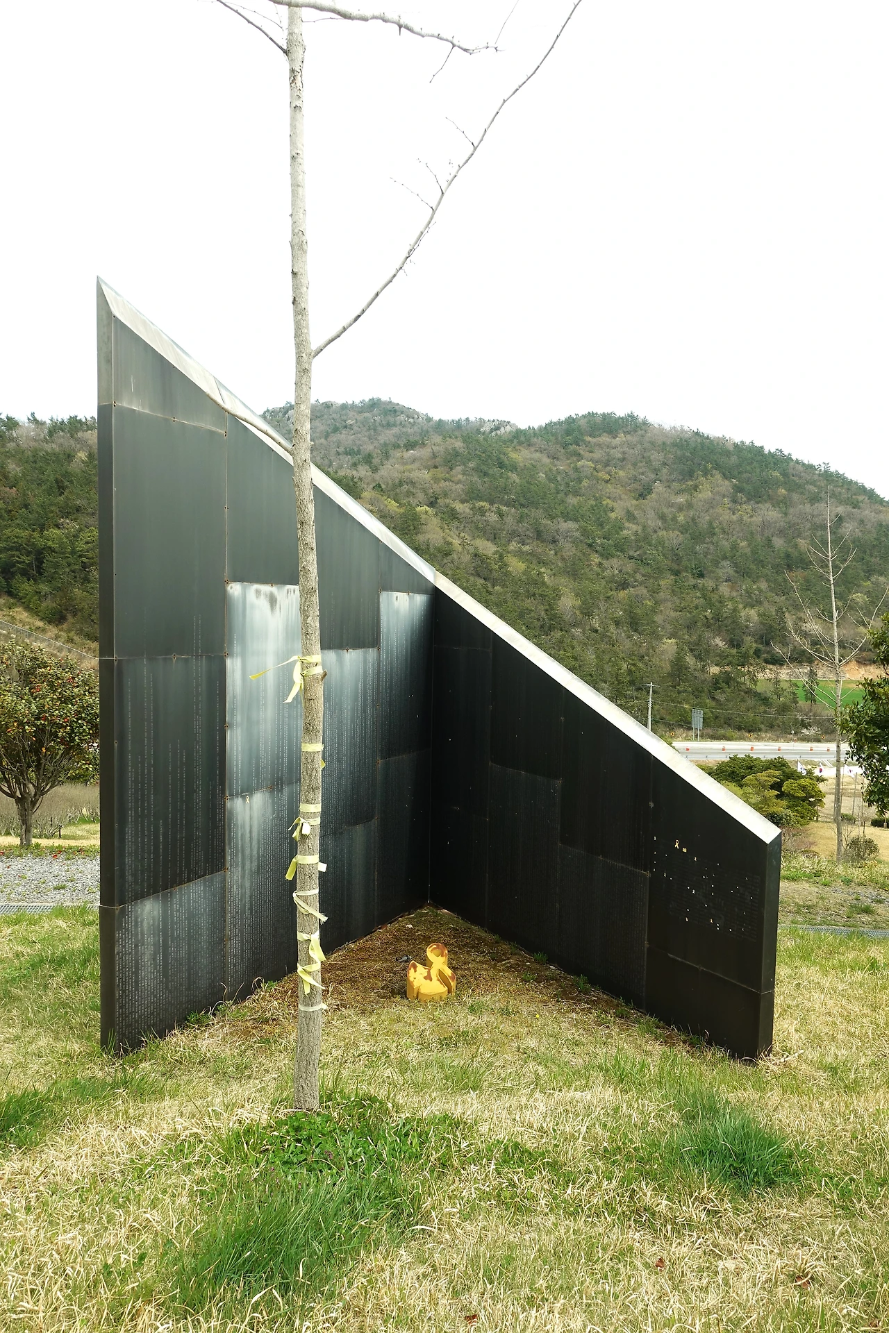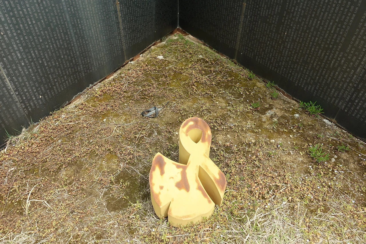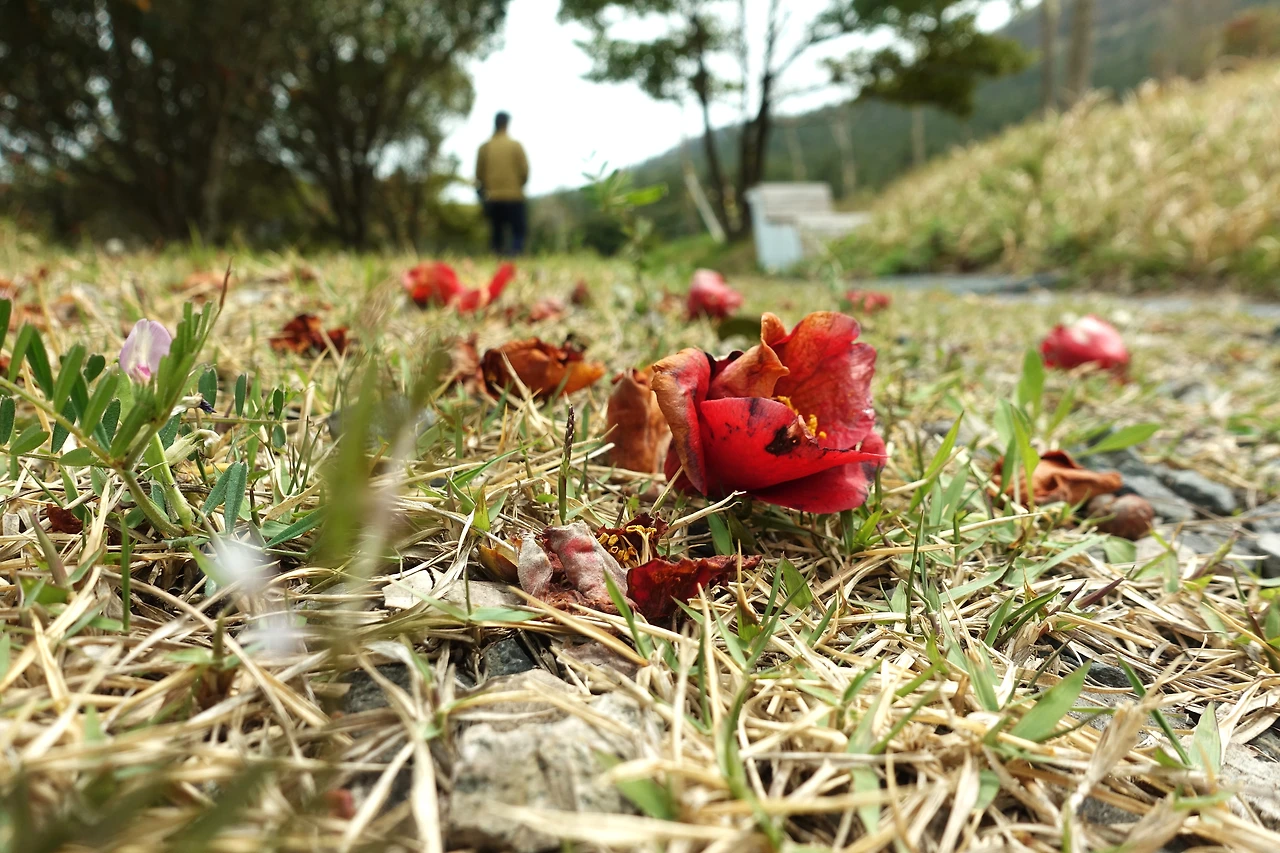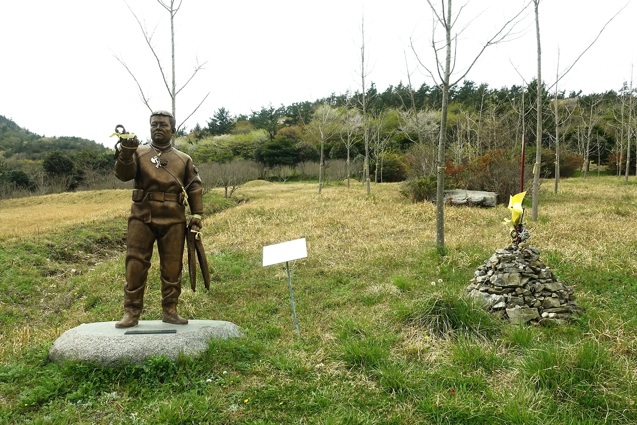 아무도 없는 숲에는 동백꽃이 아직 남아 있었고, 김관홍 잠수사 동상은 변함이 없었지만, 의자는 녹이 슬었고, 은행나무는 몇 그루 잘려있었다.