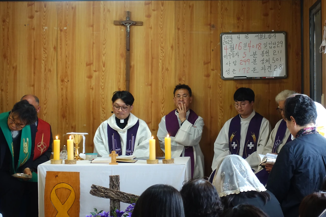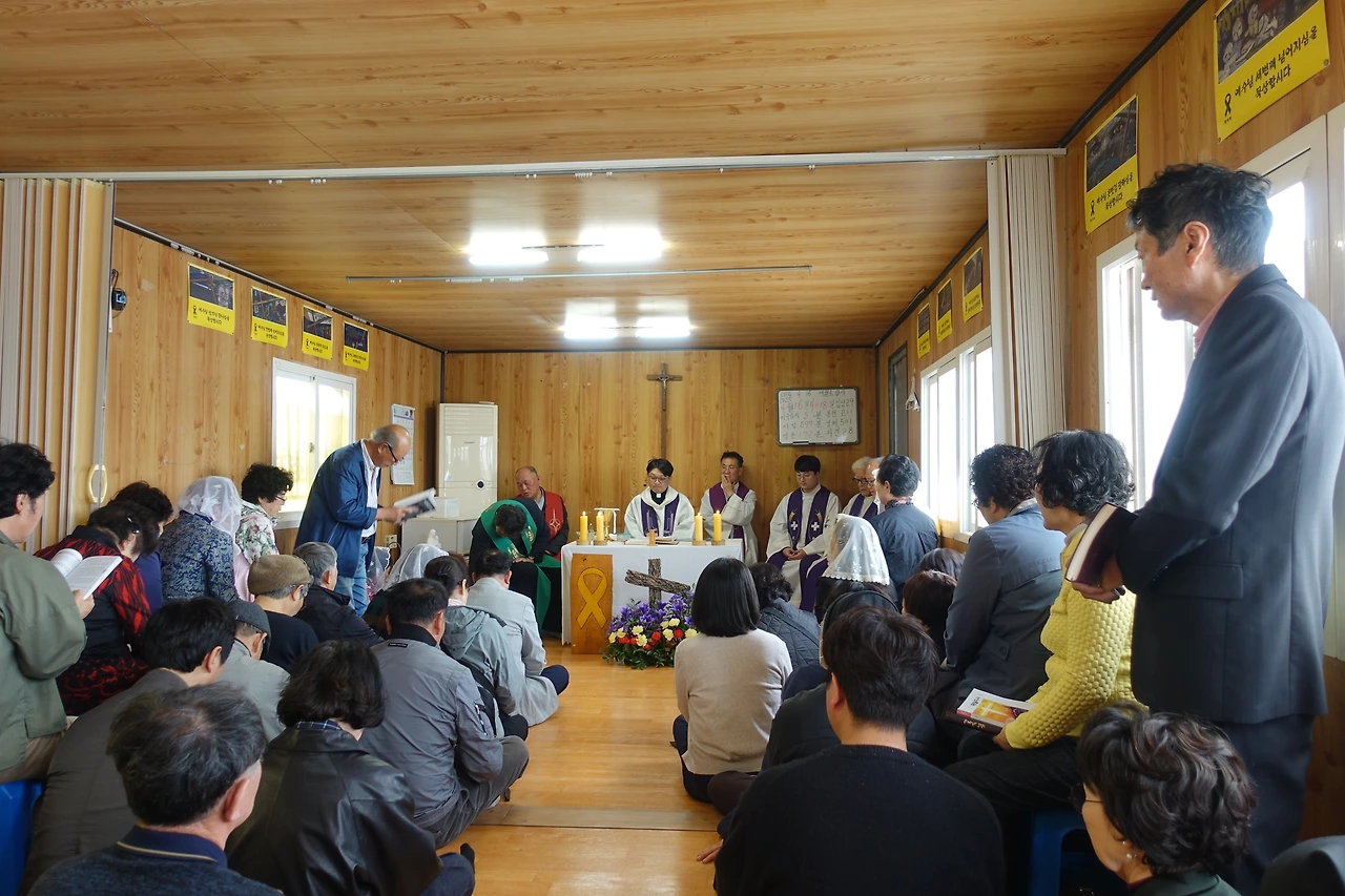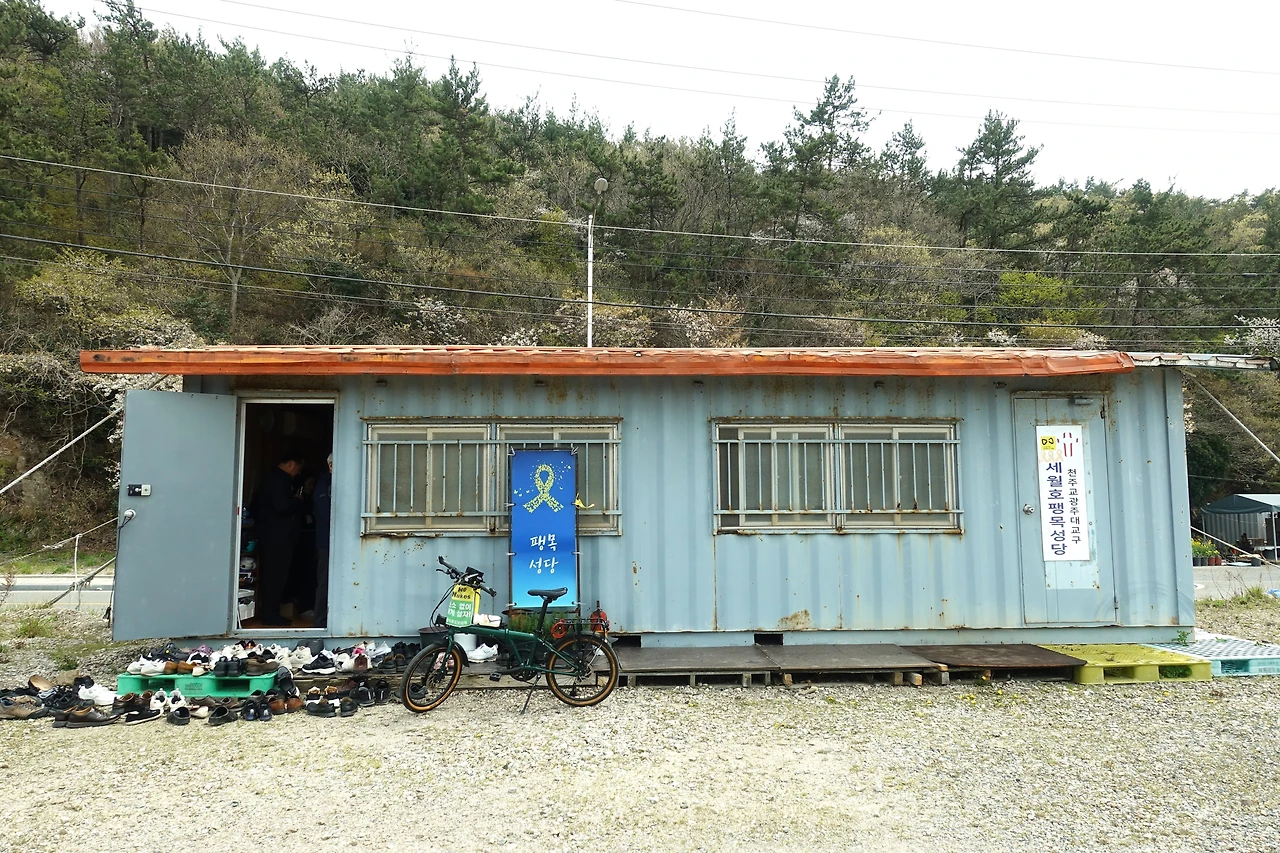 오후 2시, 팽목 성당에서 참사 4018일 미사를 봉헌했다. 작년과 달리 인파가 가득했다. 여러 신부님 중 5·18 민주화운동 피해자셨던 김성용 신부님도 계셨다. 미사 후 달걀 담은 닭 모양 수세미와 백설기와 두유와 노란 실 묵주를 나눠주셨다. 부활절 맞이였다.