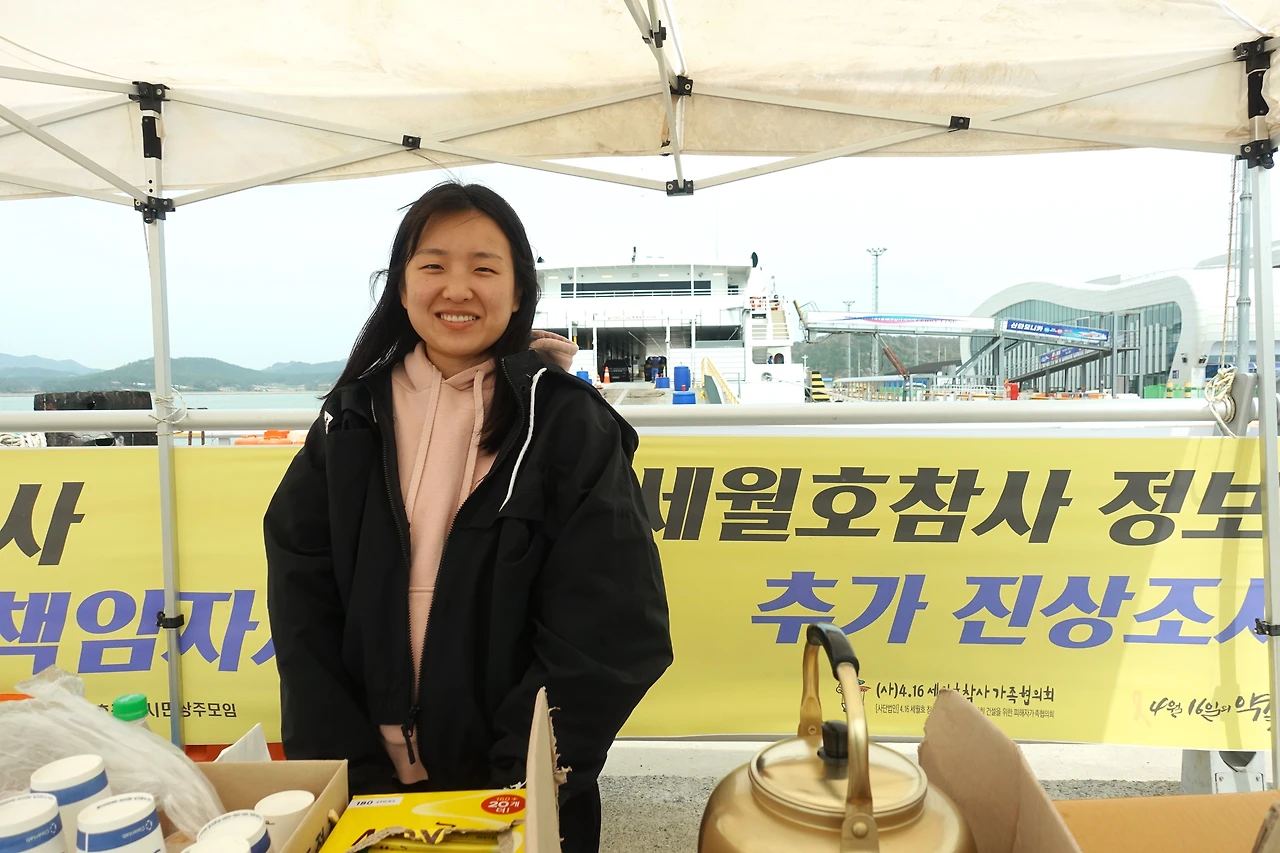 11년 전 세월호 참사 다음 날부터 진도 체육관으로 가서 세면대 청소를 도맡았던 부친. 가만히 있으면 마음이 불편하고 힘이 들어 해마다 팽목항에 와서 커피와 음료를 무료로 나눠주는 분. 그렇게 열한 번 중 삼 년 전부터는 딸과 함께 나오는 분. 딸이 좋은 어머니가 되기를 바라는 마음으로 팽목항에 동행하는 분.