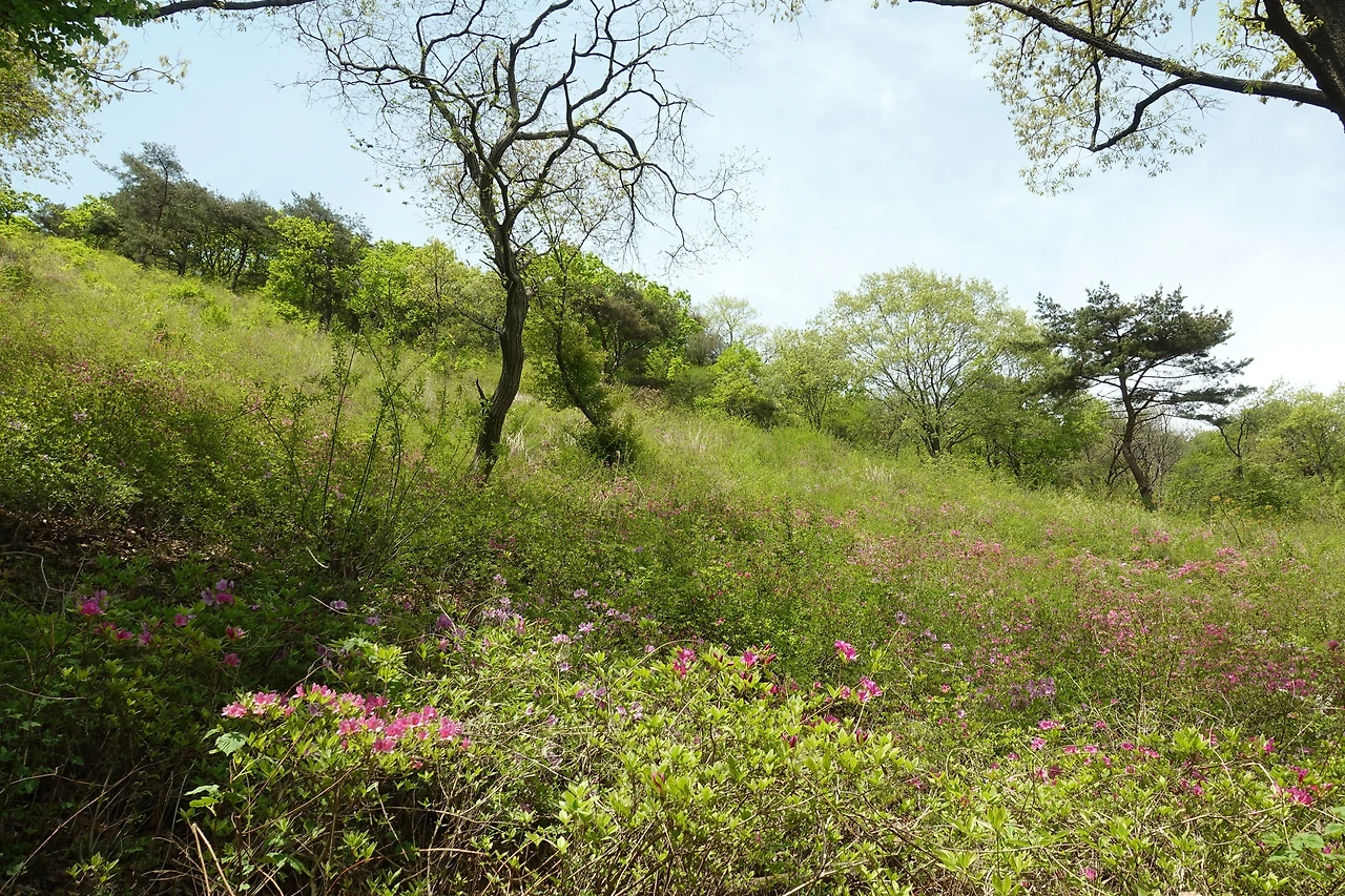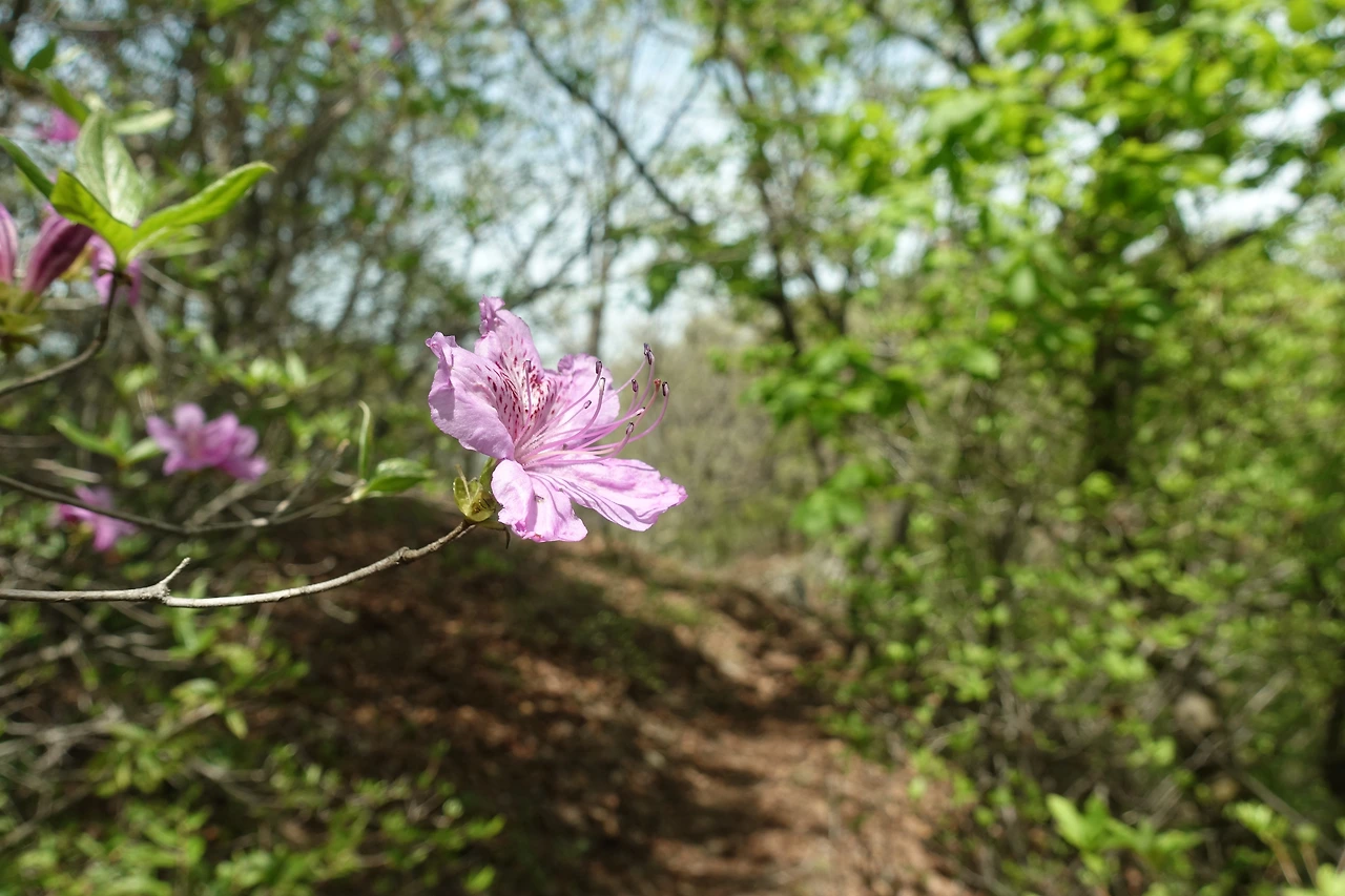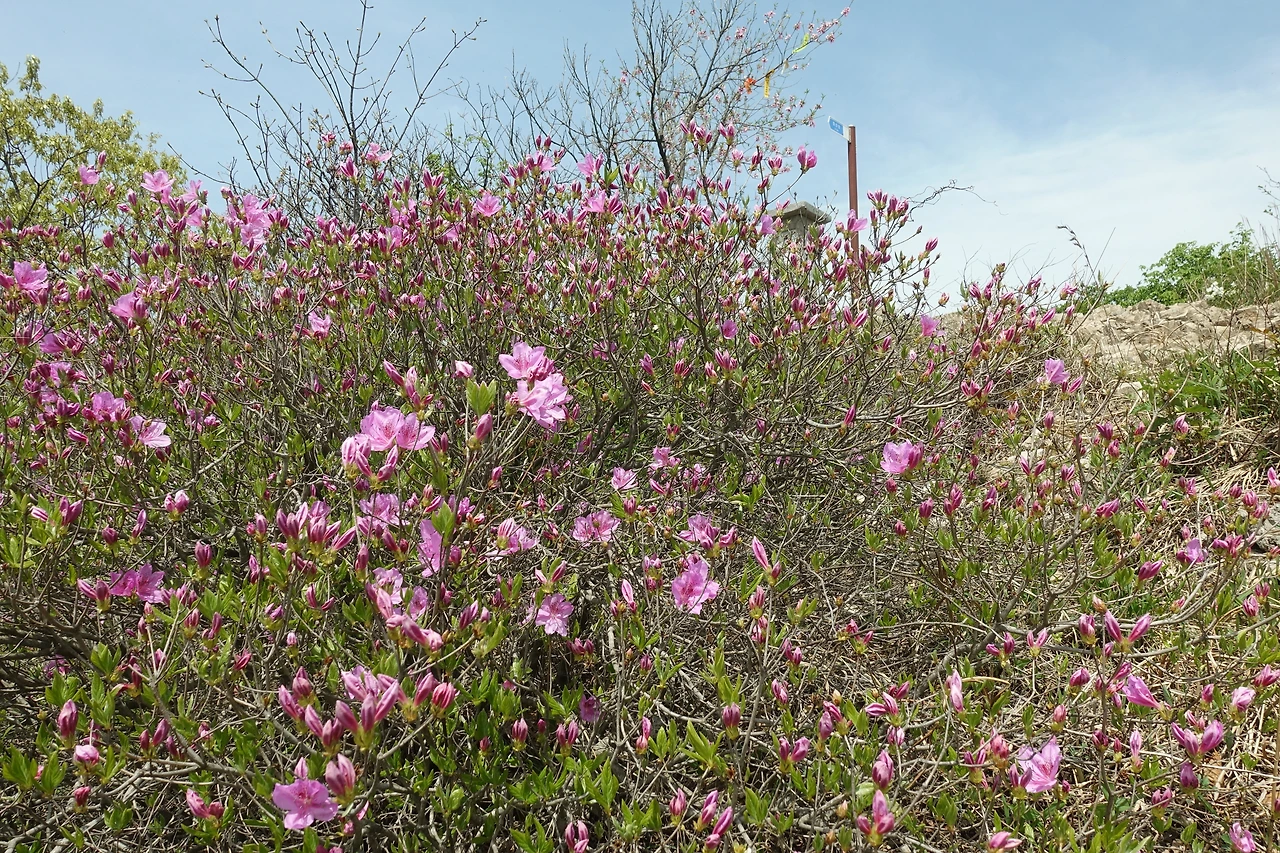 거대한 바위를 지나 정상까지 가는 길에 진달래가 활짝 피었다.