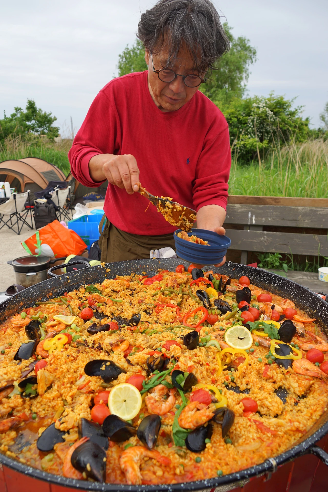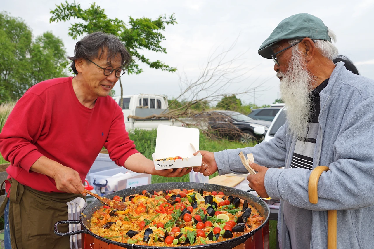 격렬한 춤바람은 잔잔한 넬켄라인 댄스로 변하여 팽나무를 한 바퀴 돌았다. 모처럼 즐거운 에너지 소모 후 든든한 한 끼의 빠에야와 공룡 영길 샘의 연잎밥과 미역 국수와 들깨 수제비와 두부조림과 공룡 설해의 참외 샐러드 등으로 풍성한 식사를 했다. 거기에 내 상추도 곁들였다.