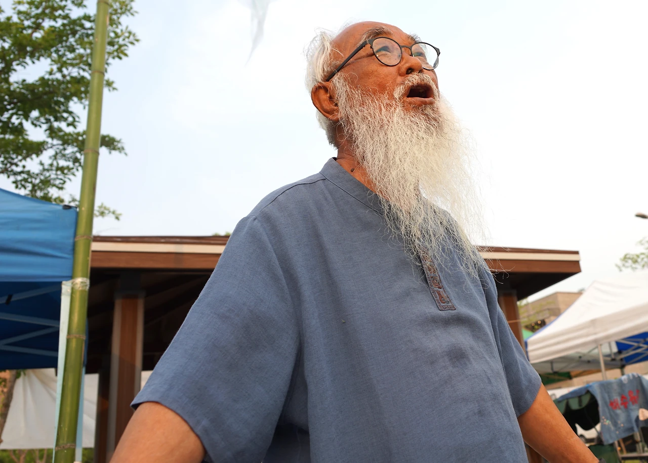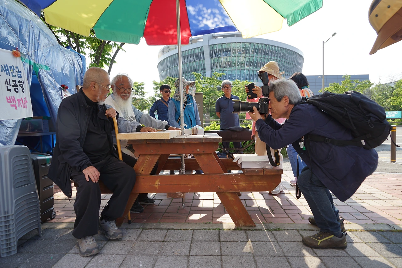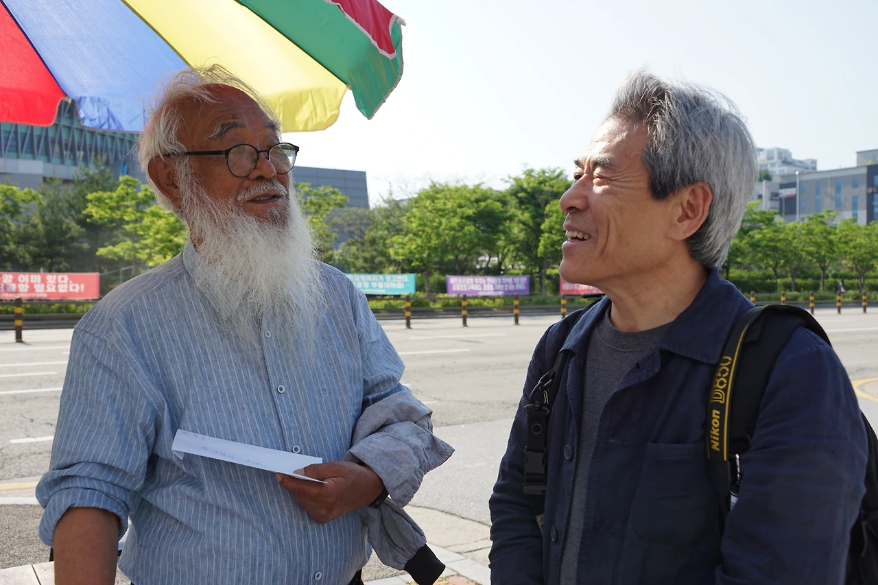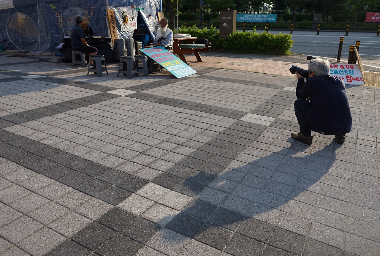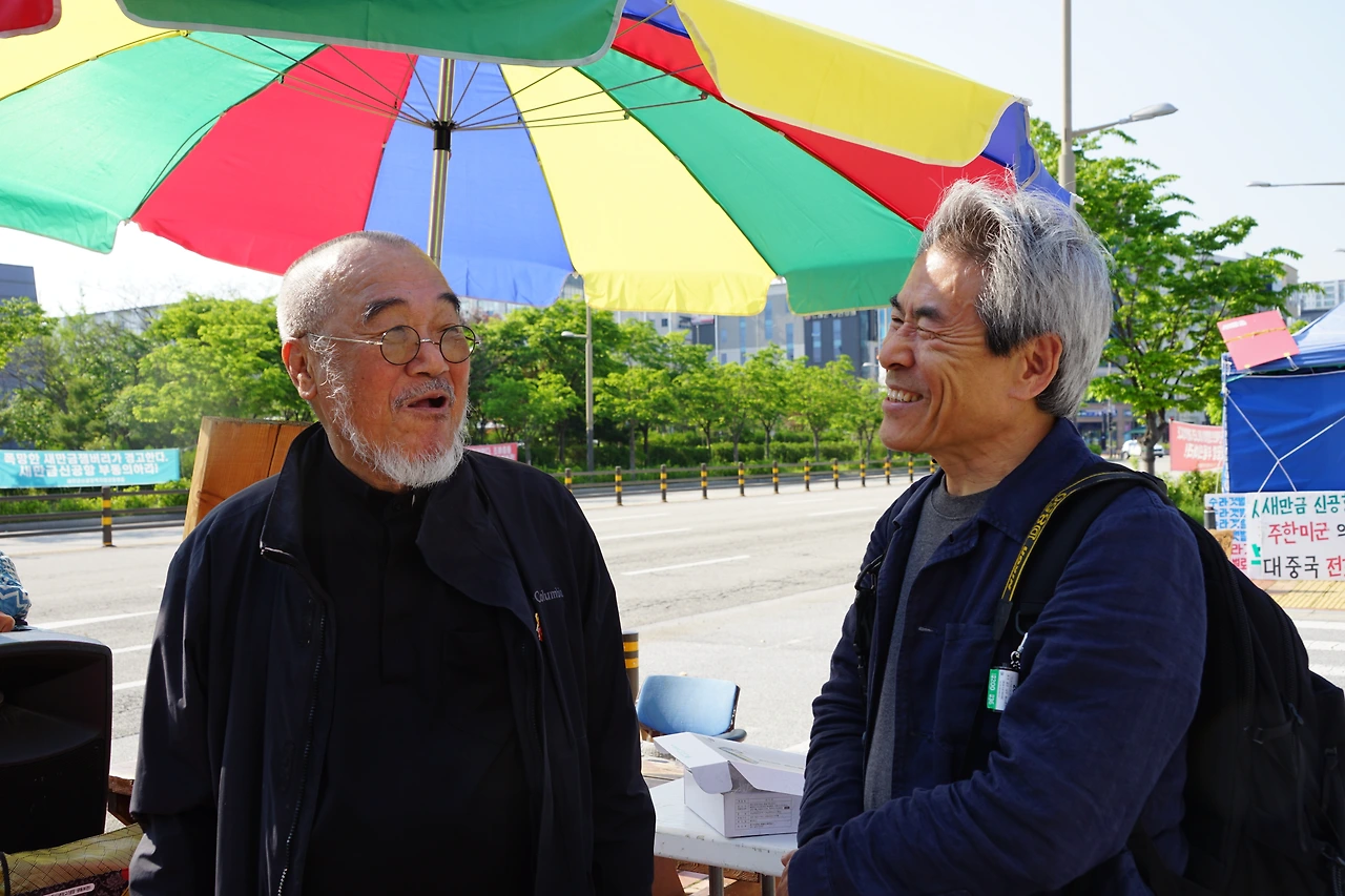 강재훈 선생님은 2019년 청와대 앞 9일 기도 때 문정현 신부님과 문규현 신부님 사진을 한겨레 신문에 실으신 적이 있다. 물론 나도 두 분을 찍었지만, 선생님 사진이 실린 신문을 들고 가 두 분께 드리면서 그 사진을 찍었었다.