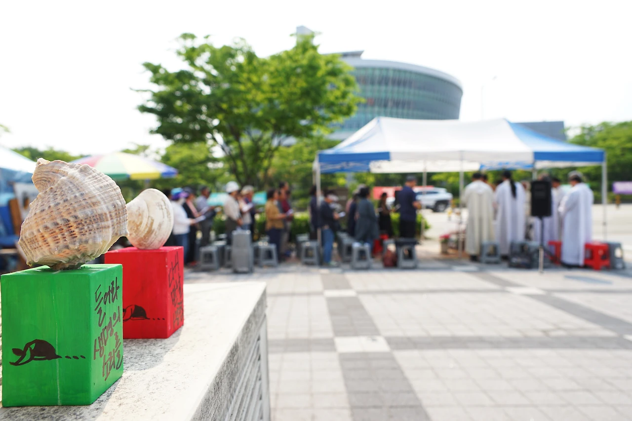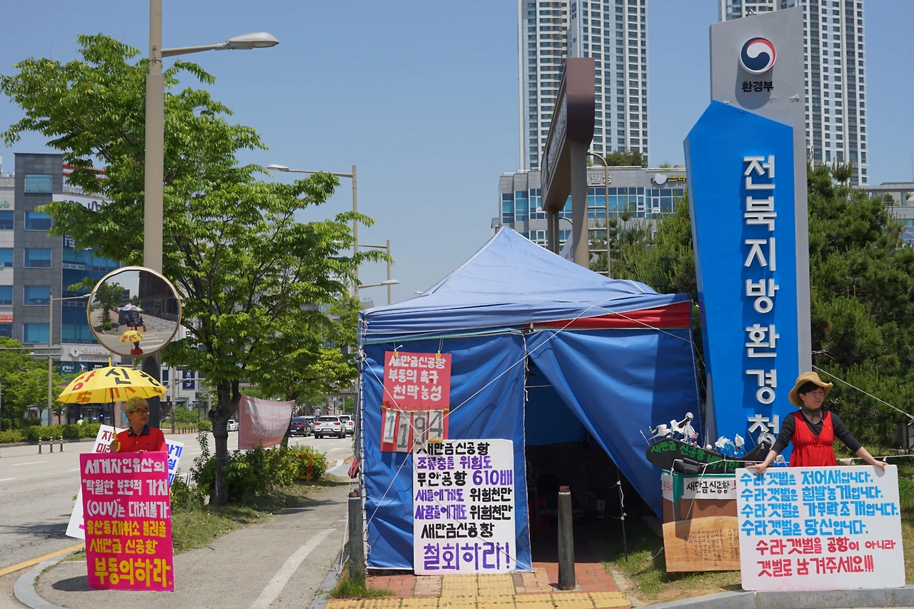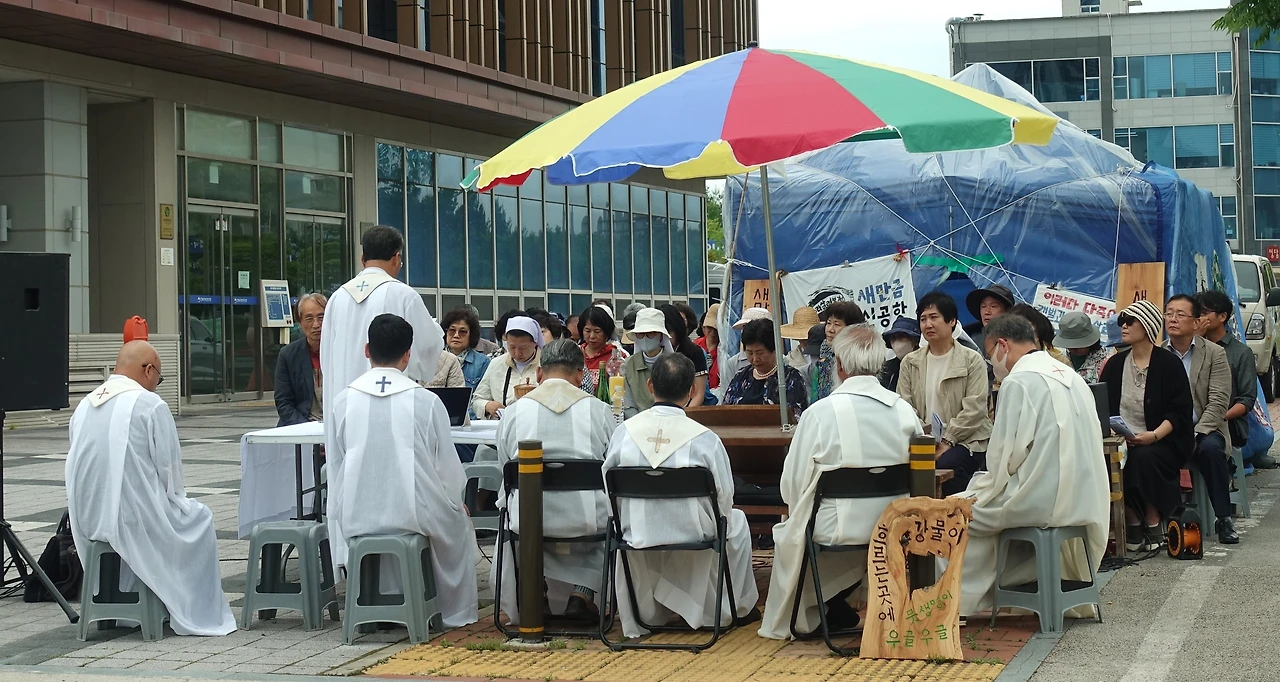 천막 옆 문정현 신부님을 뵙자마자 신나게 불렀는데 아뿔싸 오후 세 시 미사 중이었다. 전주 전북지방환경청 앞에선 두 번째, 새만금 상시 해수유통과 생태계복원 기원 월요 미사로는 28회째였다.
