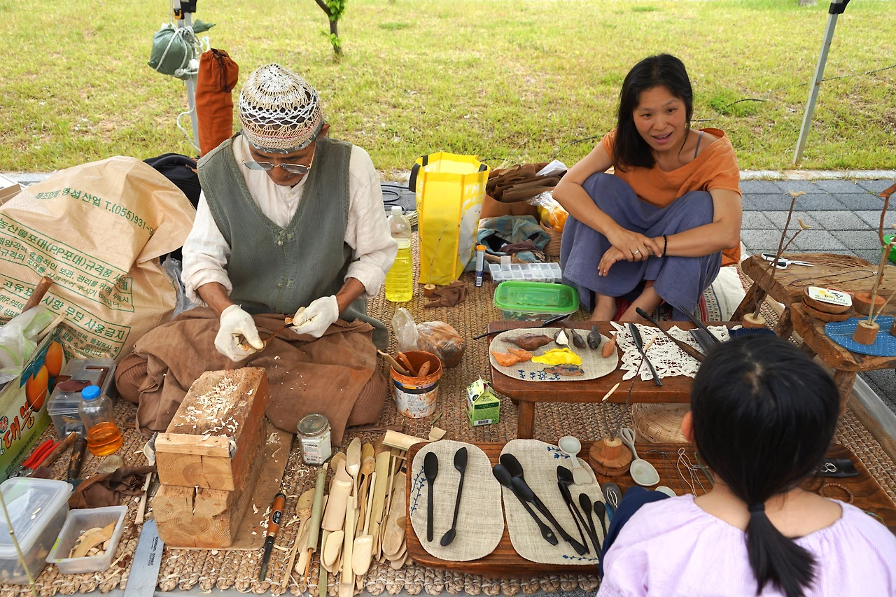 전주 전북지방환경청 앞에 장터가 섰다. 헌 옷 몇 가지 대충 있는 아나바다일 줄 알고 갔는데 웬걸 남원 인월에서 온 장인과 딜위의 공예품, 도자기 공예, 친환경 주방용품, 헌책과 헌옷, 광주 아시아 목판화연구소와 설치미술팀, 대안학교 솟대와 팔찌 만들기, 채식 김밥과 메밀전 등 볼거리와 먹을거리가 가득했다.