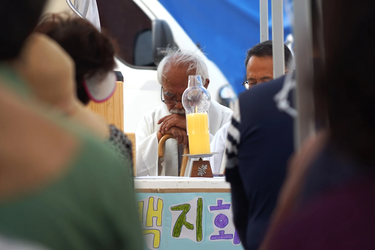 열한 분의 신부님과 31명의 신도가 몰아치는 바람 속에서 천막도 없이 미사를 드렸다.
