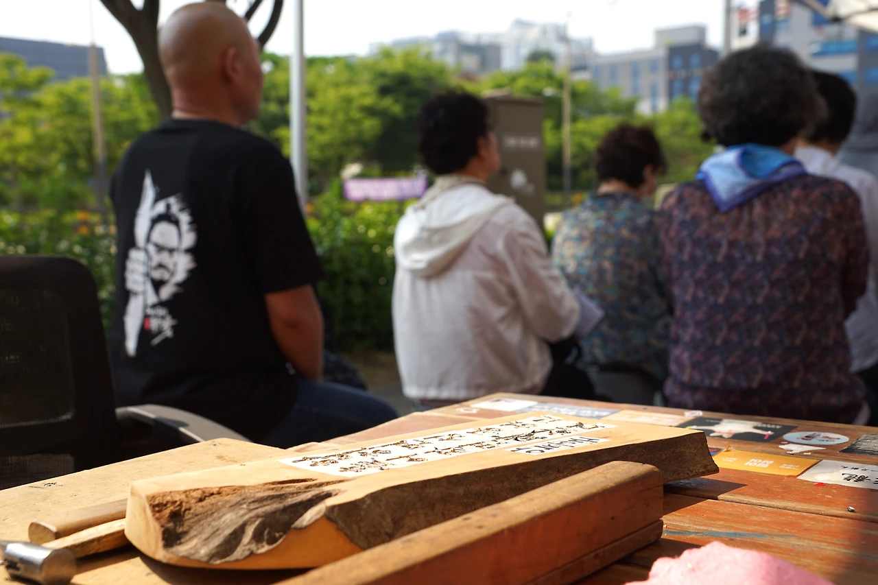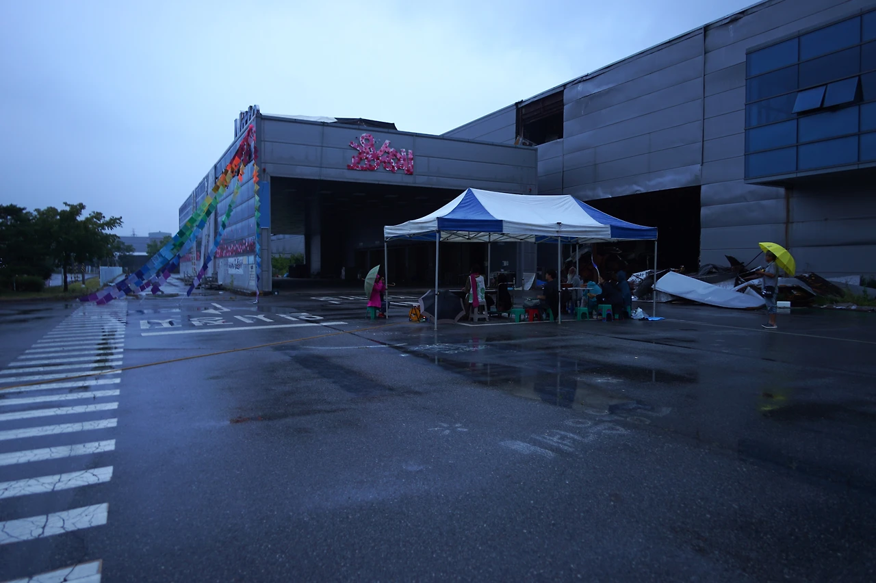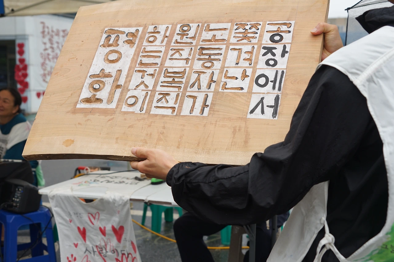 공장에 어둠이 내리자 빗속에 천막을 치고 나무의 연주와 노래 곁에서 우리는 함께 앉아 담소했다. 옥상의 박정혜 동지가 우리 소리를 듣고 있겠지 하며. 아래에서 두런두런 들리는 소리를 들으며 조금이라도 위로가 되기를 바라며. 어두운 하늘에서는 낭만과 비애가 비에 섞여 내렸다.
