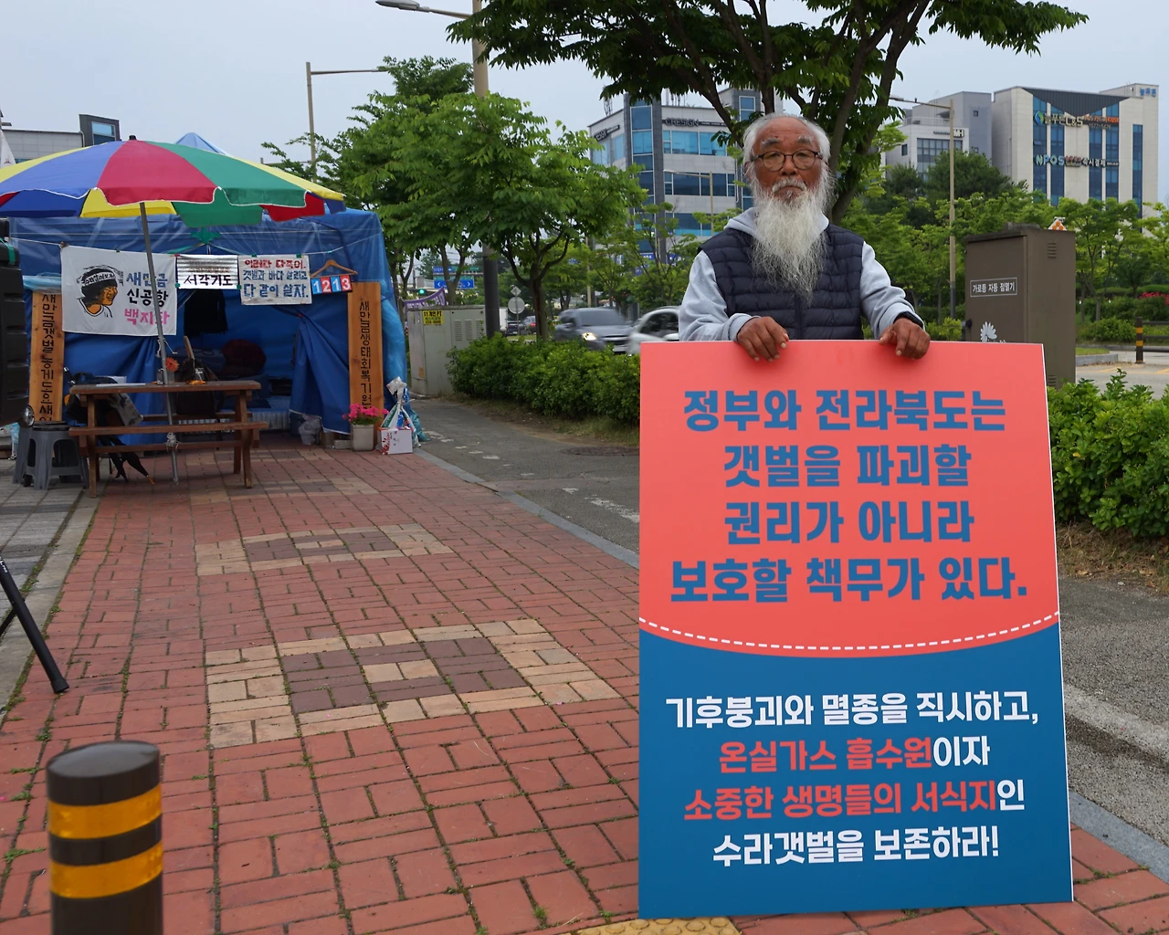 35년간 어머니 지구가 아파하고 있다고. 이 사악한 짓을 2050년까지 하겠다고, 결정된 국가사업이니 진행하겠다고, 평화로운 이 나라를 전쟁의 위험으로 몰아넣는 새만금 신공항은 중국전면전이라고, 전 세계 전쟁이 남의 일이 아니라고. 무안공항 참사는 다시는 일어나면 안 되는 참사인데, 새만금은 그 조류충돌 위험이 630배가 높다고. 사람이 할 짓이 아니니 무고한 이들을 난자하지 말라고, 이제 더는 새와 고기들이 생명을 잃어서는 안 된다고, 바다와 갯벌과 우리 어머니 지구가 아파하는 일이 일어나서는 안 된다고 하셨다.