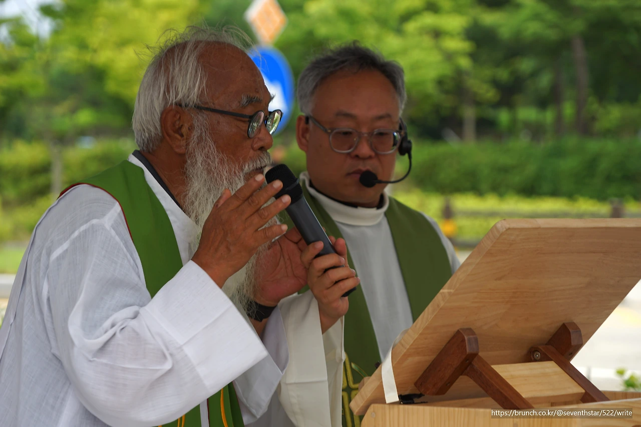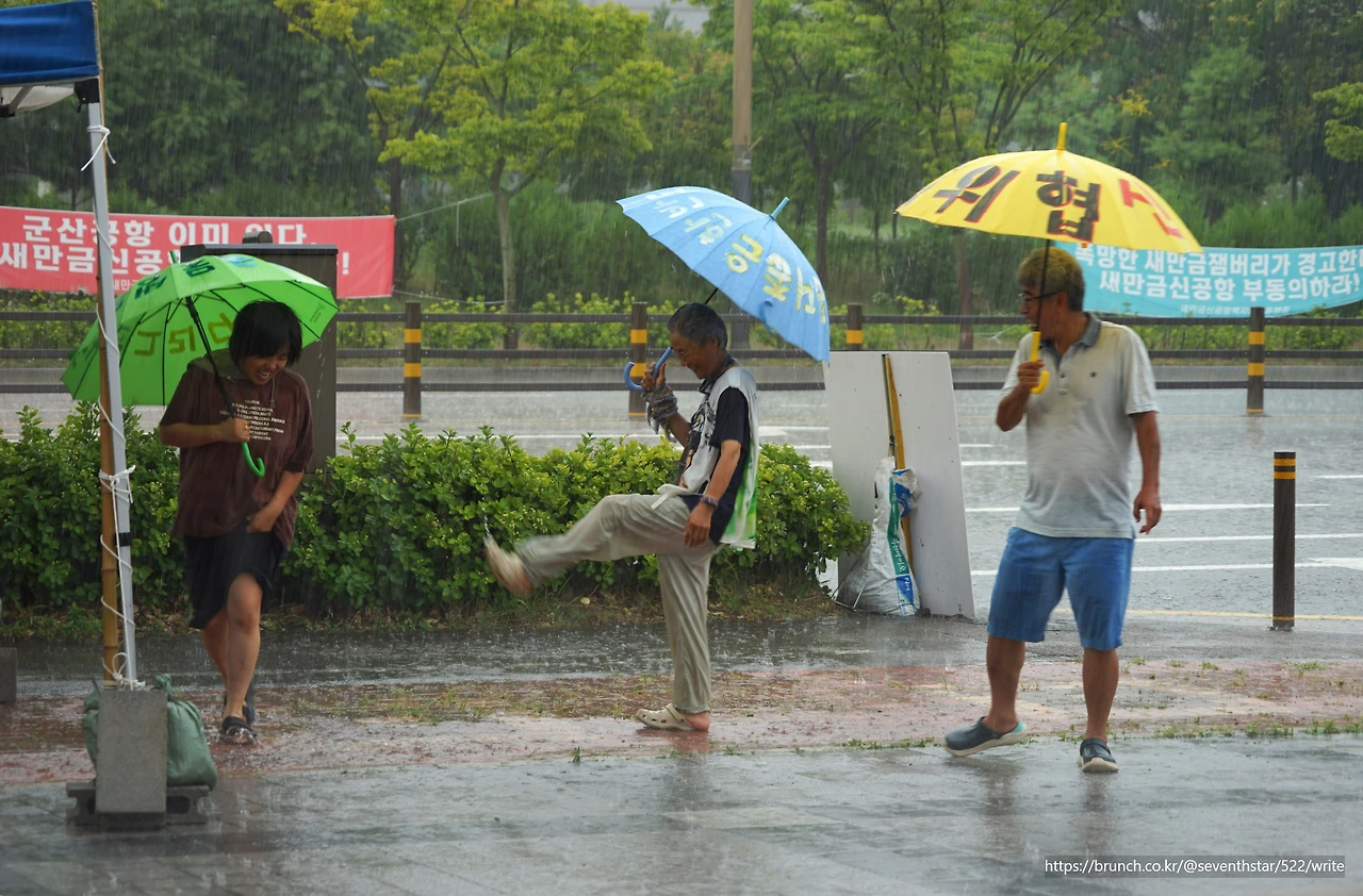 깊고 깊은 계곡 옆 외딴 수도원에서 열흘 칩거 후 세상으로 나가 집보다 먼저 전주 전북지방환경청 앞 새만금 신공항 환경영향평가 부동의 촉구 천막 농성장에 들렀다. 완두와 가지가지와 샘이 땡볕 아래 피켓을 들고 점심 선전전 중이었다. 하느님 대리로 찾아간 문정현 신부님은 무더위 푹 절인 상태이셨다.