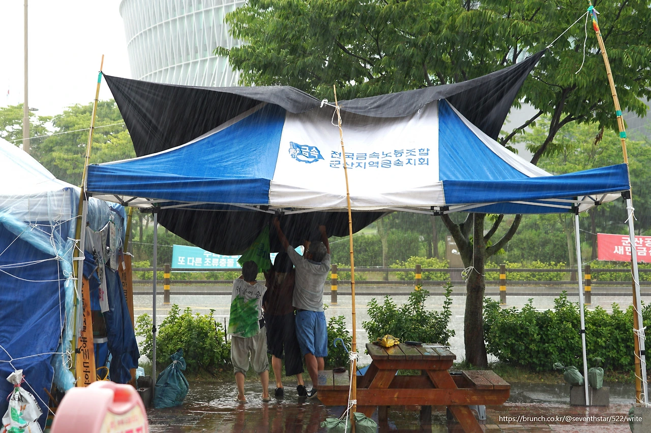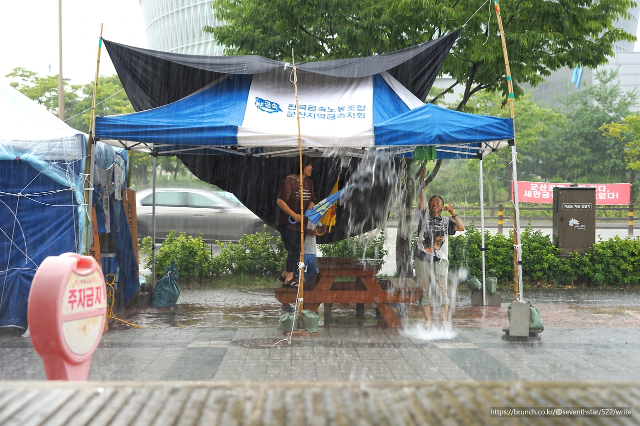 벌써 석 달 넘게 평일 매일 새벽 여섯 시 반이면 조반 드시고 나오셔서 아침 8~9시 출근 선전전, 점심 12시 전후 한 시간 점심 선전전, 오후 5시 반부터 6시 반까지 퇴근 선전전을 하시고 들어가시니 과로이신데다가 천막의 온도는 40도를 웃돌고 있었다.