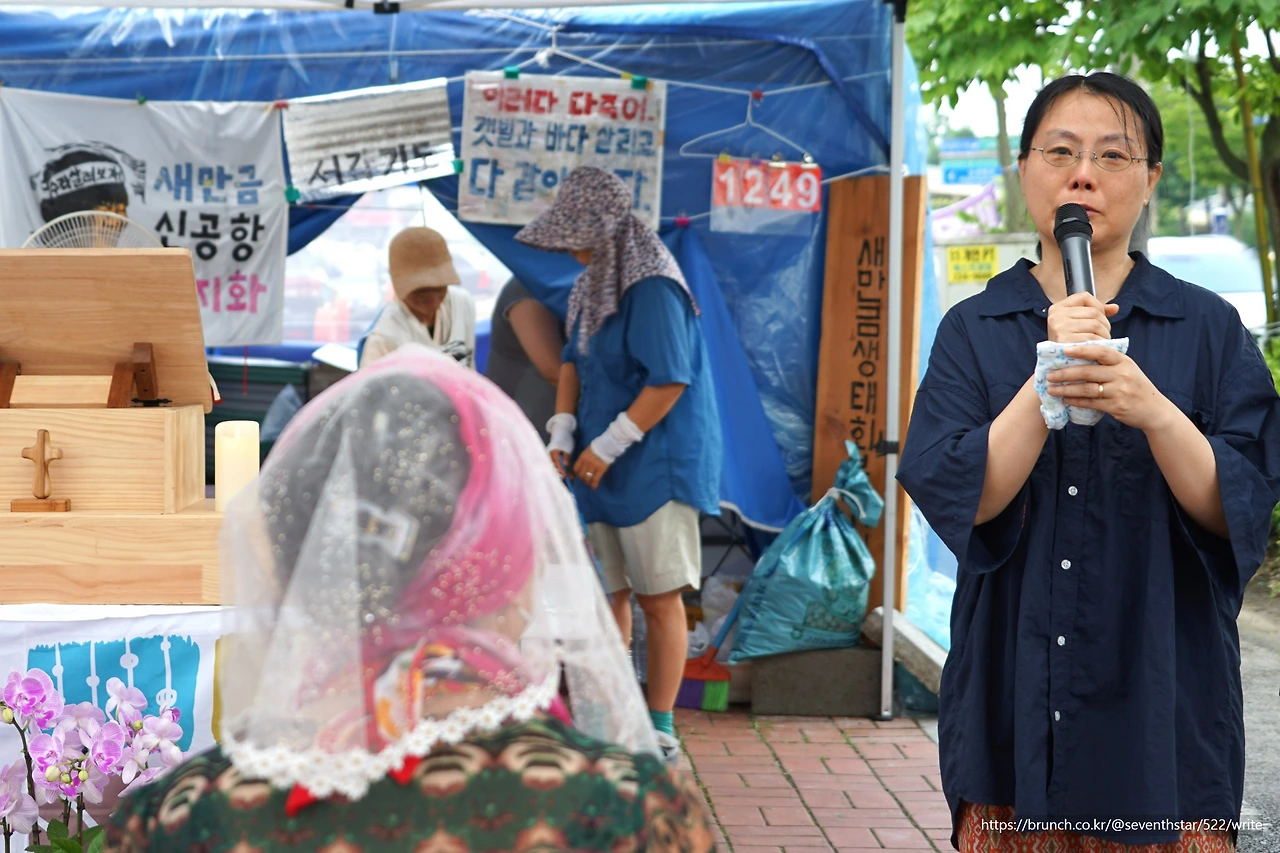 미사 후 김지은 전북녹색연합 사무국장이 마이크를 잡았다. 미사 때부터 손수건으로 눈물을 닦아내던 그이는 말보다 먼저 울음으로 오신 분들을 맞이했다. 세종시 국토부 앞에서 2022년 2월 6일부터 2025년 3월 9일까지 천막 농성을 했다. 그때 함께해 주었던 분들이 3월 10일에 전주 전북지방환경청 앞으로 천막을 옮기자, 7월에 와 주신 것이었다.