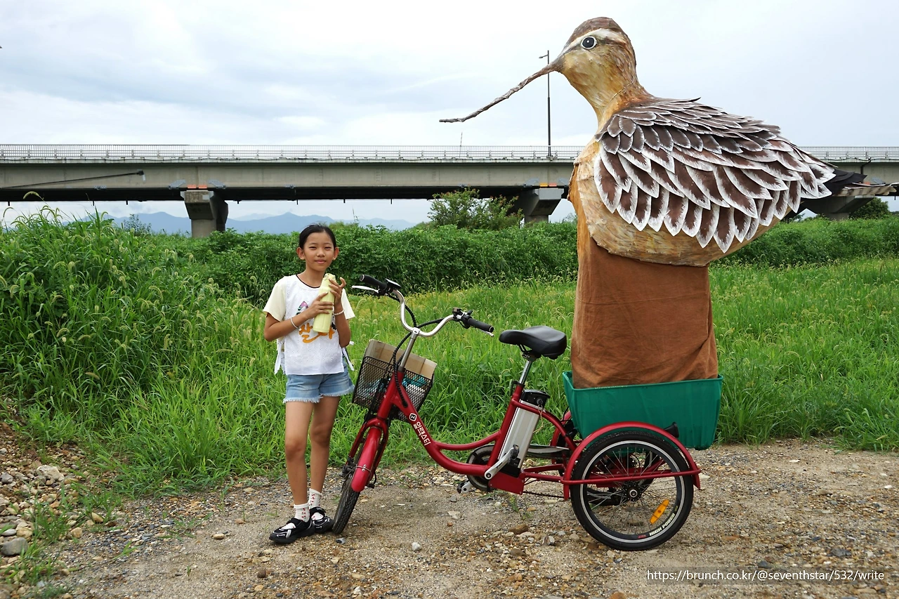 빗방울이 오락가락하는 사이 4km쯤을 더 가다가 오른쪽 내리막길로 내려갔다. 거기 새만금으로 흘러 들어가는 두 갈래 강줄기 중 하나인 만경강이 있었다. 새만금 상시 해수유통으로 바다와 쉬이 만나야 할 만경강. 자전에 실려 온 큰뒷부리도요 한 마리가 그 곁에서 행진 첫날 잠시 머물렀다.