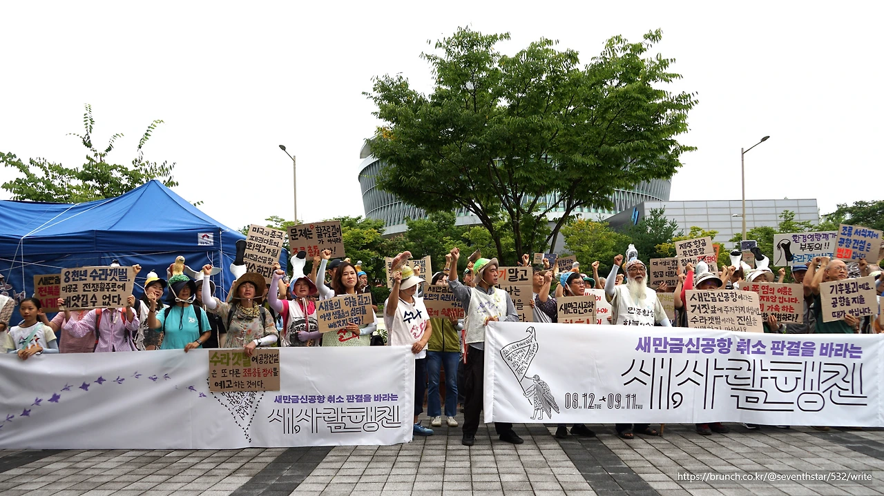 여기 환경부, 아무 대답이 없어. 그리고 수라갯벌 공군기지 하지 말라고 촉구하는데. 여길 떠나는 이유가 그것 때문이야. 9월 11일에 맞춰서 양재동 행정법원에 가서 이 새만금 갯벌에 공항 만들지 말라고, 그렇게 판결하라고 하기 위해서 떠나는 것입니다.