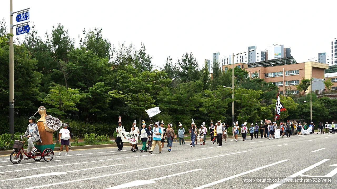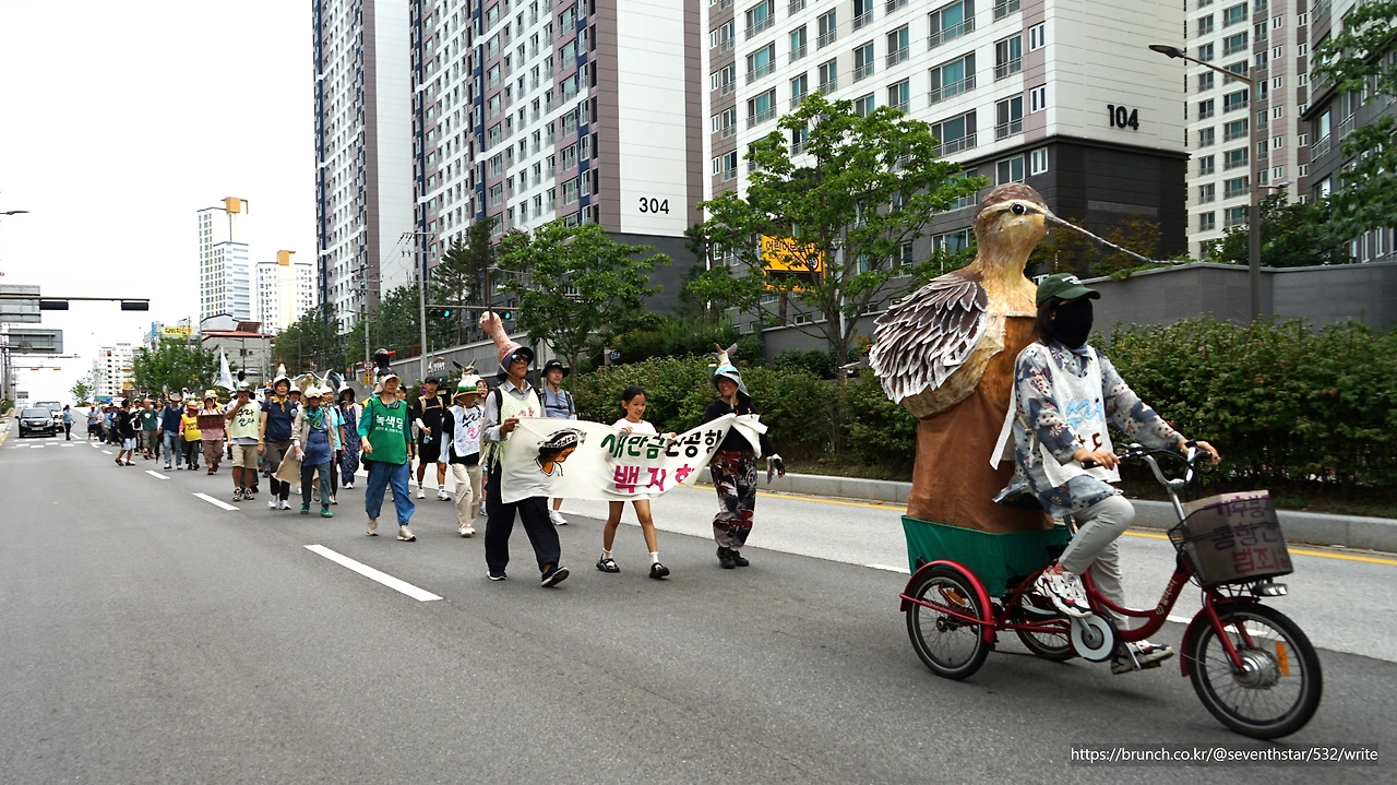 일단 이렇게 함께 하는 사람들이 너무 귀하고요. 엄청나게 빨라지고 다 우수수 흩어지는 세상에서 함께 느리게 걷는다는 행진의 방식이 귀합니다. 이 인간중심의 사회에서 새를 앞세우는 행진의 틀이, 새가 귀합니다. 여전히 개발이 기본방향인 사회에서 공항 말고 갯벌을 외치는 행진 목적이 너무나 귀합니다.