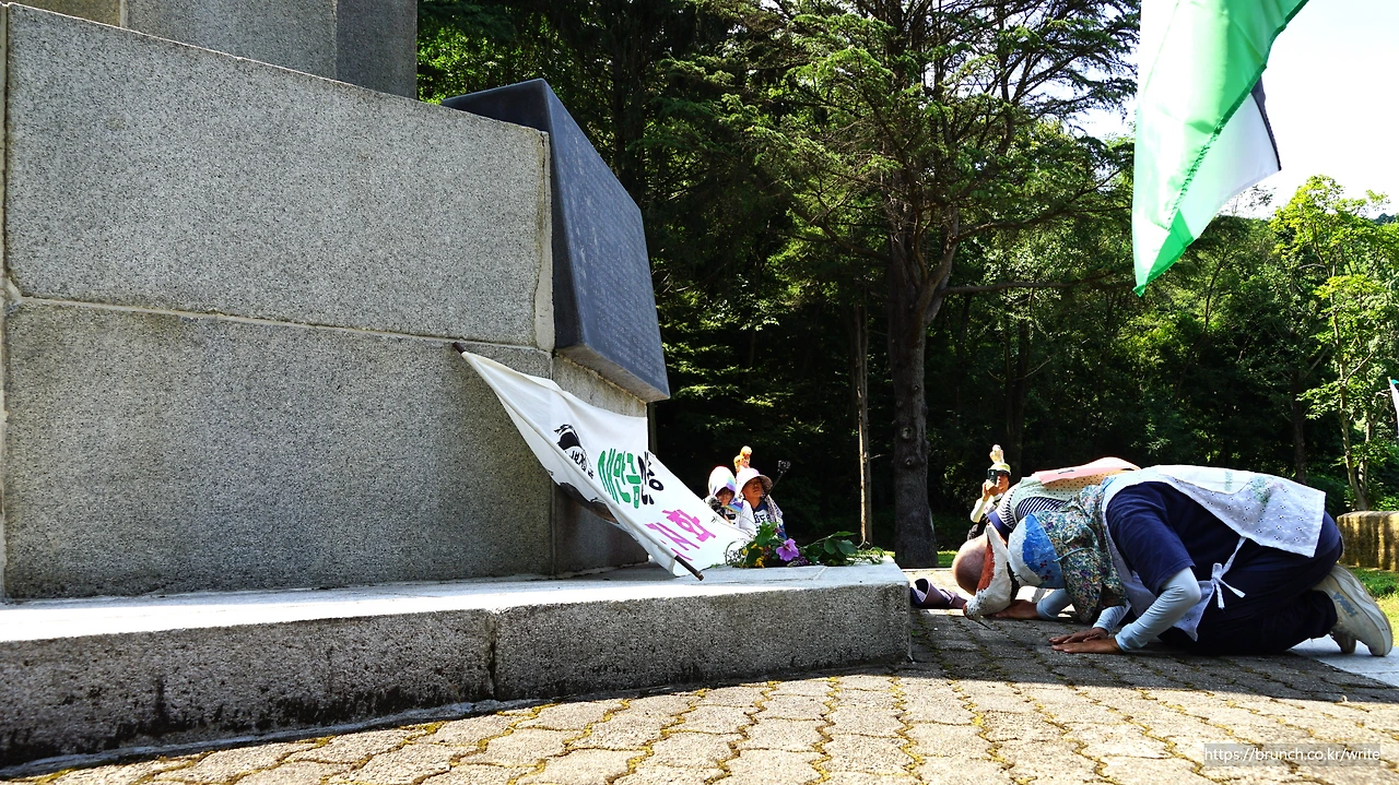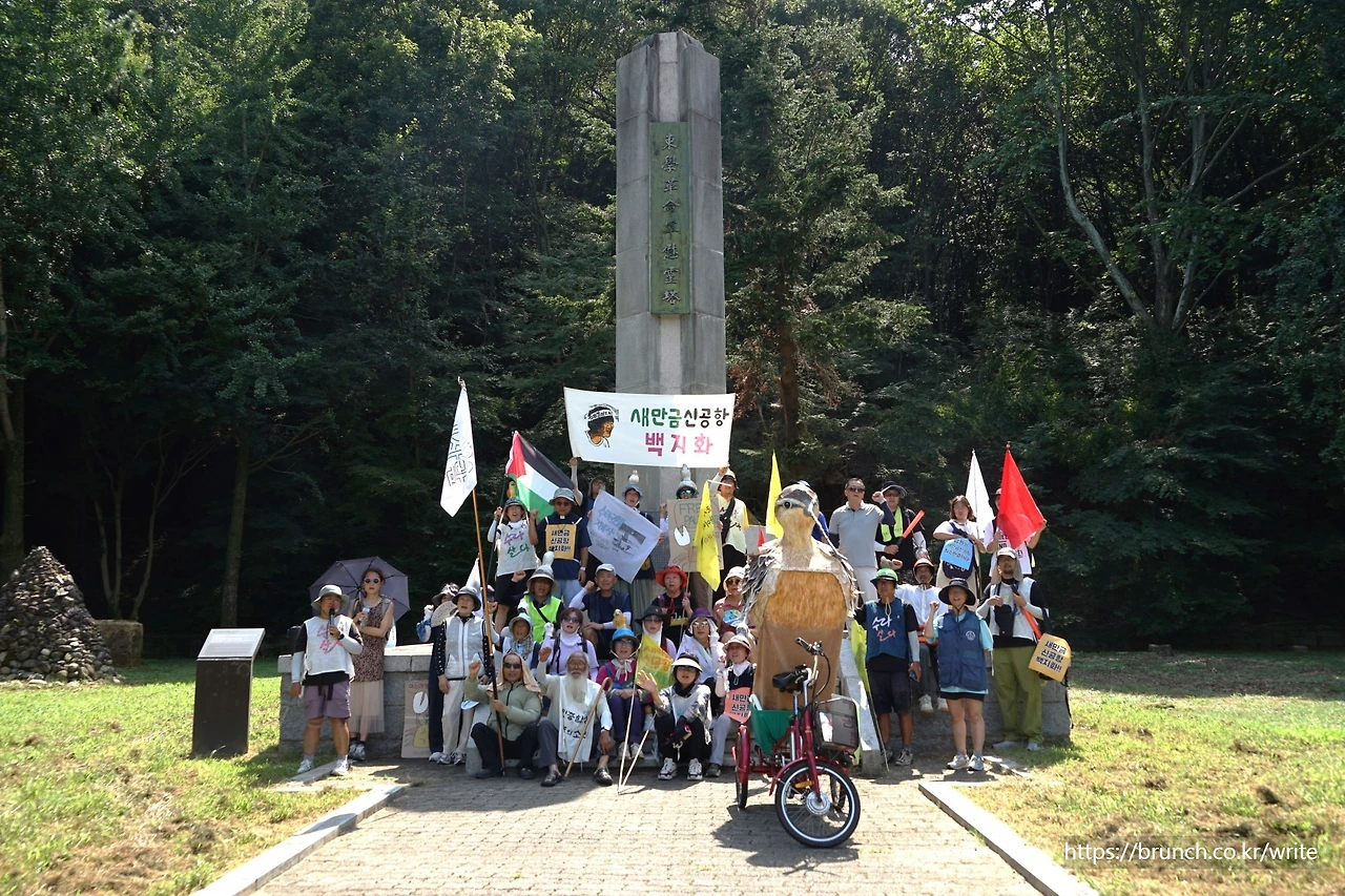 이어 두 단장님이 헌화와 절을 했고, 우리는 큰뒷부리도요와 더불어 천천히 걸어 올라오시는 문정현 신부님을 기다려 함께 사진을 찍었다.
