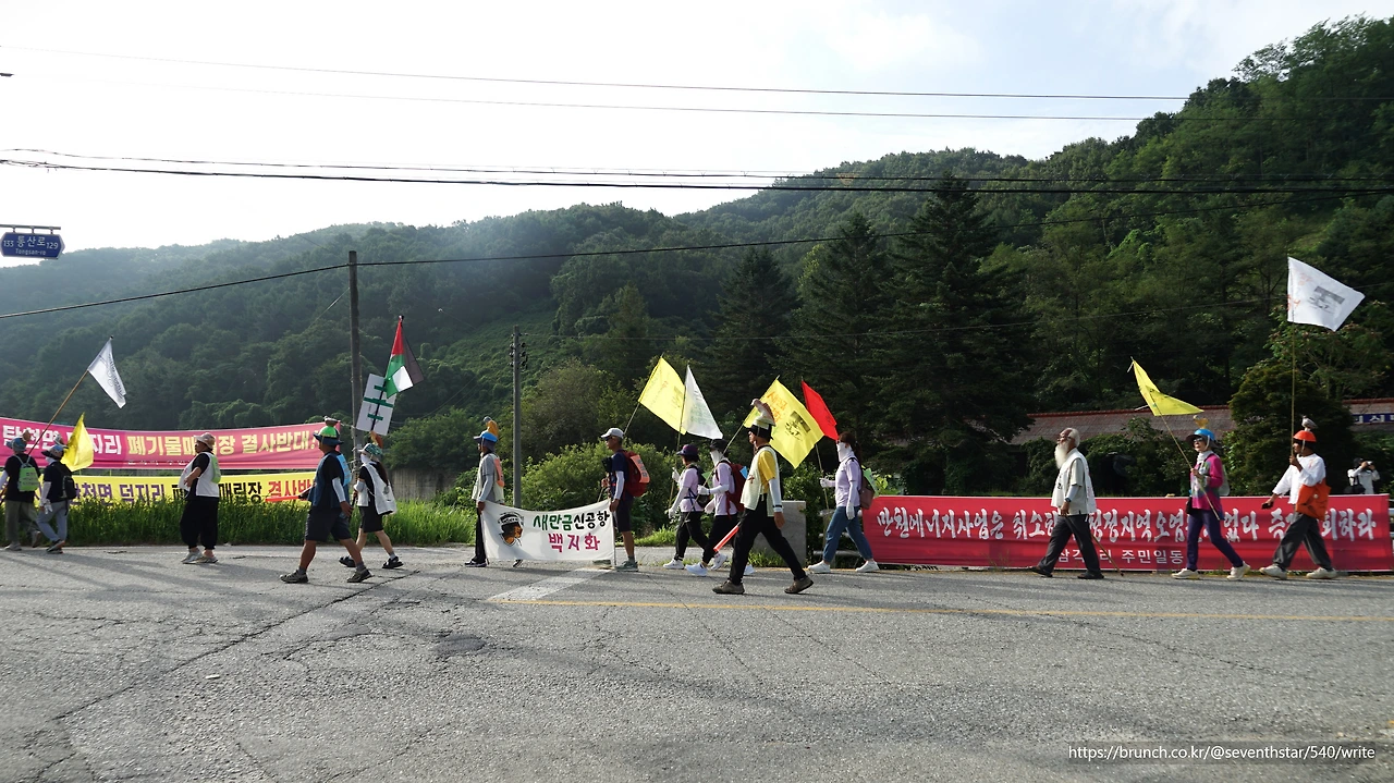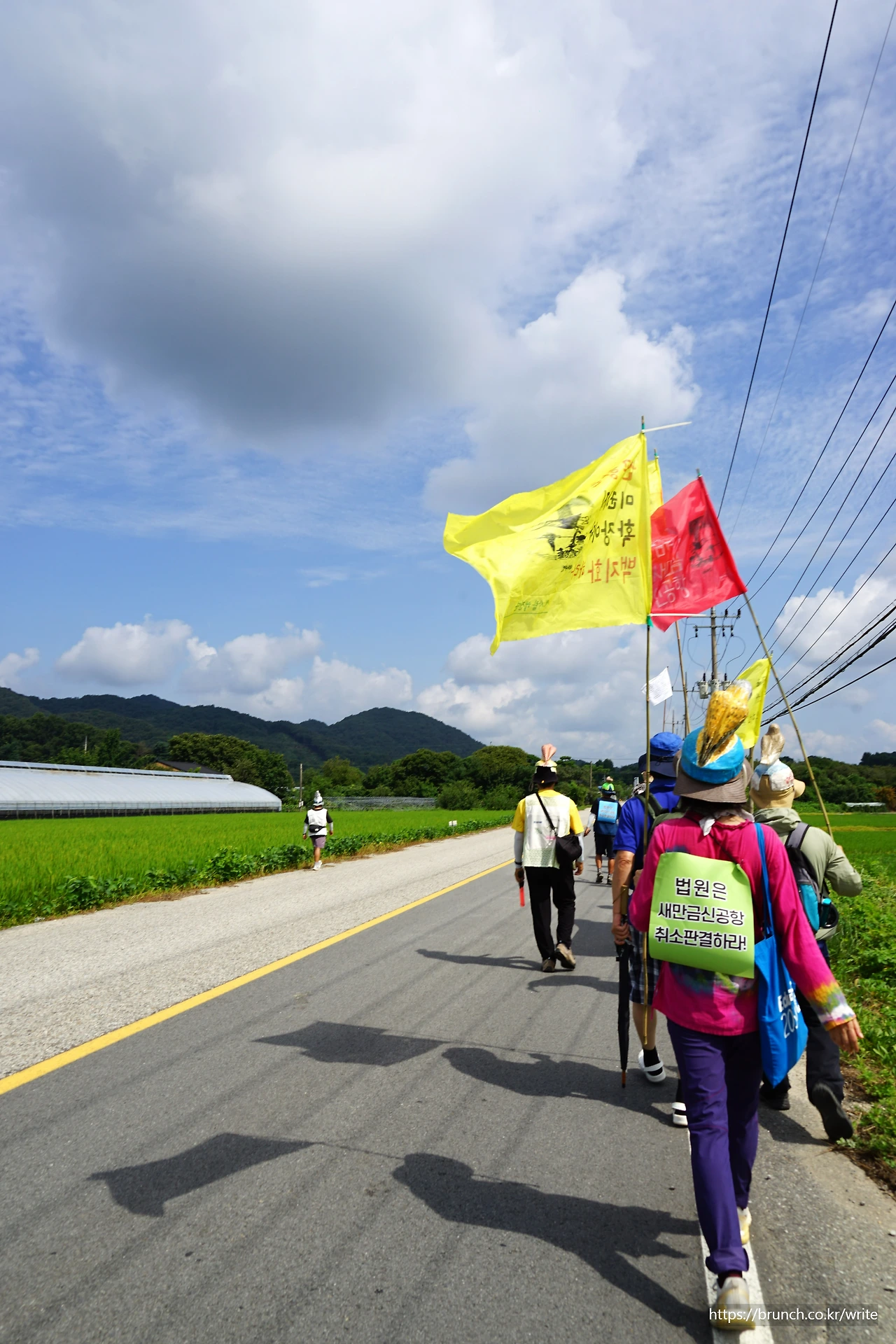 오전 열 시, 공주이인파출소에서 화장실과 정수기 사용을 했다. 서천과 부여에 이어 공주까지 오는 동안 경찰과 꽤 가까워졌다. 나는 파출소 정수기에서 나오는 얼음이 신기해서 신이 났는지 경찰에게 우리가 왜 걷는지 열심히 설명했다. 군경이 동족일지라도 수라갯벌에서 무슨 일이 일어나고 있는지는 알아야 하지 않겠나. 그들도 경찰 이전에 시민이지 않은가. 그런 나를 딸기가 쓰윽 쳐다보고 나갔다. 노동운동을 해온 가지가지는 며칠 전 부여에서 경찰과 싸우기만 했지 수고했다고 인사 나눈 건 처음이라고 했다. 반평생 운동만 해 온 딸기도 크게 다르지 않을 것이다. 족보나 노선 없이 마음 가는 대로 활동하는 나는 상식선에서 크게 적대시할 사람이 별로 없다. 새만금 신공항을 백지화하자고 하는 행진 아닌가. 한 사람에게라도 더 알리는 게 행진단원으로서 할 일이다.