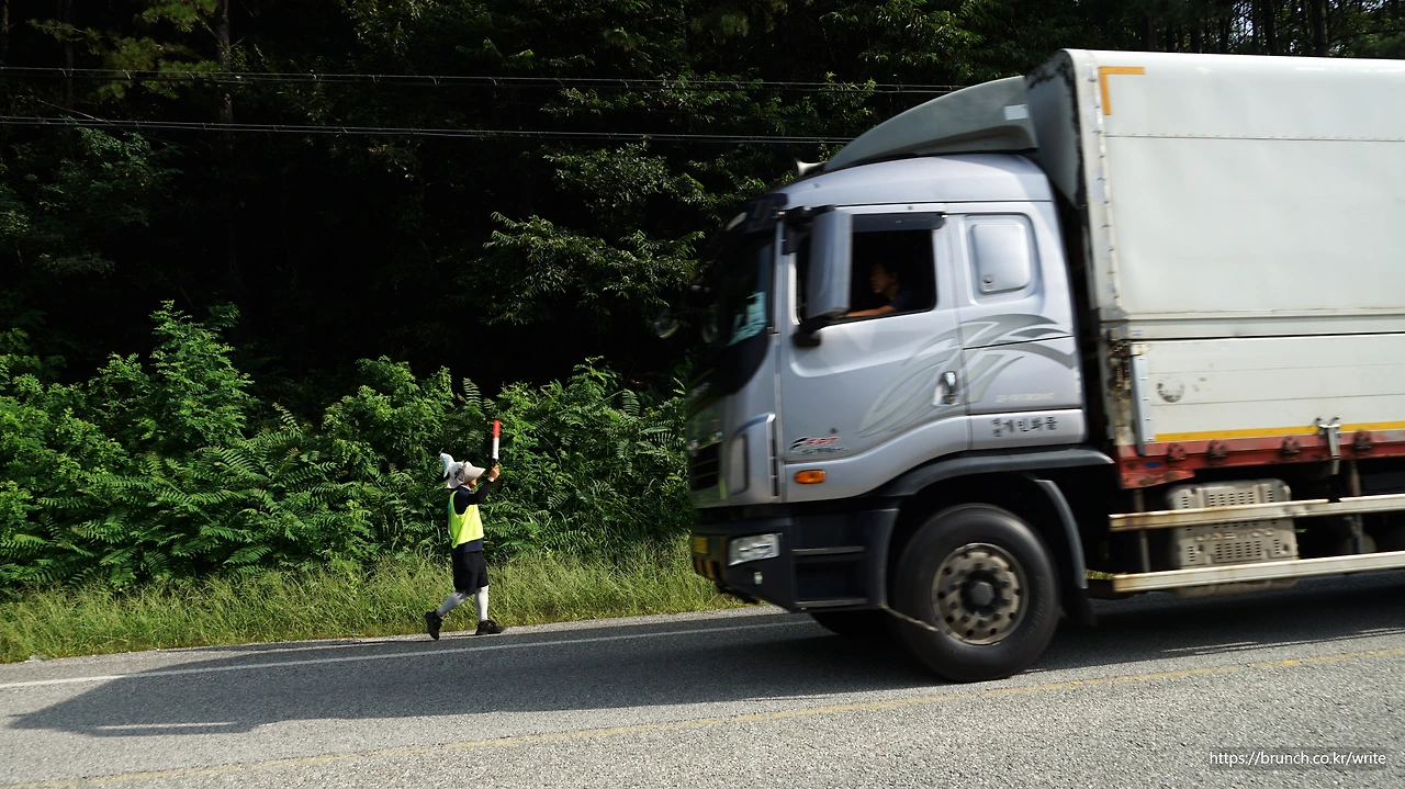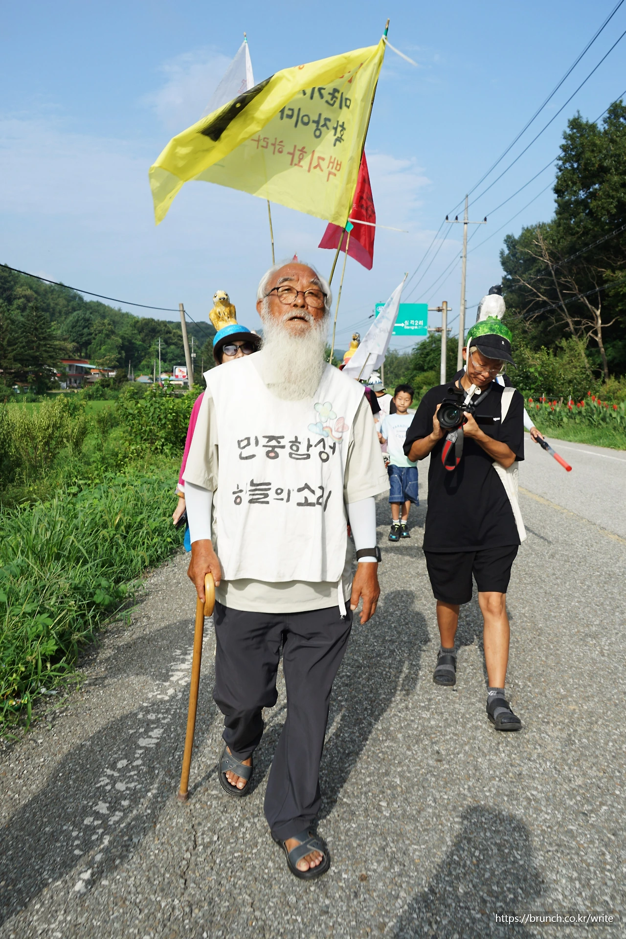 행진 처음 얼마간 함께 걸으시는 문정현 신부님의 맨발 샌들과 지팡이는 일평생 겪어오신 풍찬노숙의 의연함을 보여주신다. 신부님 곁에서 카메라를 바꿔 들며 따라오는 공룡 설해는 어깨가 무너지는 무게에도 늘 웃음 짓고 뛰어다니고 있고, 덤프트럭 곁에서 행진단을 인도하는 더덕은 맨 앞에서 단단해 보인다. 행진단 총 진행을 맡은 팀장 딸기는 멈추게 하는 차량에도 깍듯하고, 말수를 최소한으로 줄이고 행진단을 독려하는 완두와 김연태 단장님은 존재만으로 든든하다. 앞과 중간 뒤에서 안전을 담당하는 가지가지와 니키와 청명은 검은머리물떼새 부리 닮은 빨간 경광봉으로 행진단을 지킨다. 함께 경광봉을 들고 안전을 담당하는 토니는 틈틈이 작품사진을 찍어 올리고, 동영상을 촬영하는 오이는 있는 듯 없는 듯 평화롭고, 실시간으로 사진 업데이트하는 인디는 매일 행진 후에도 새, 사람 잡지 제작에 잠을 잊었다. 참, 큰뒷부리도요의 집사 알알이는 직사광선을 막기 위해 겨울 장갑을 낀 채로 가끔 음악에 맞춰 검은 오른손을 흔든다. 묵묵히 후미 차량을 운전하는 다운은 행진에서 낙오하는 사람들을 수시로 태우며, 가다 서다를 반복하는 내 발걸음에 불평 한마디가 없다.