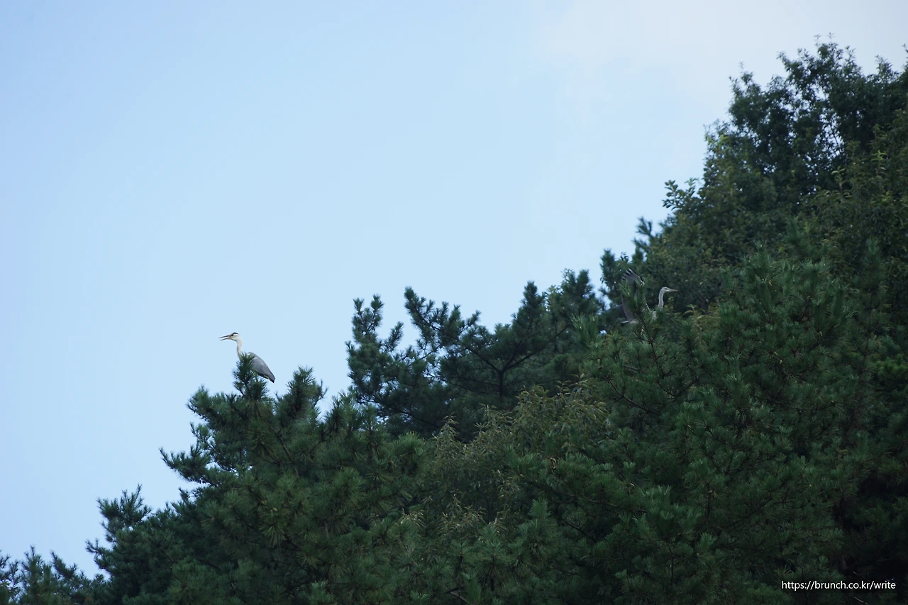 한 시간 후 다리 밑에서 첫 휴식을 하는데 왜가리 두 마리가 맞은편 높은 나뭇가지에 날아 앉았다. 새, 사람행진 가까이에는 늘 새들이 있다.
